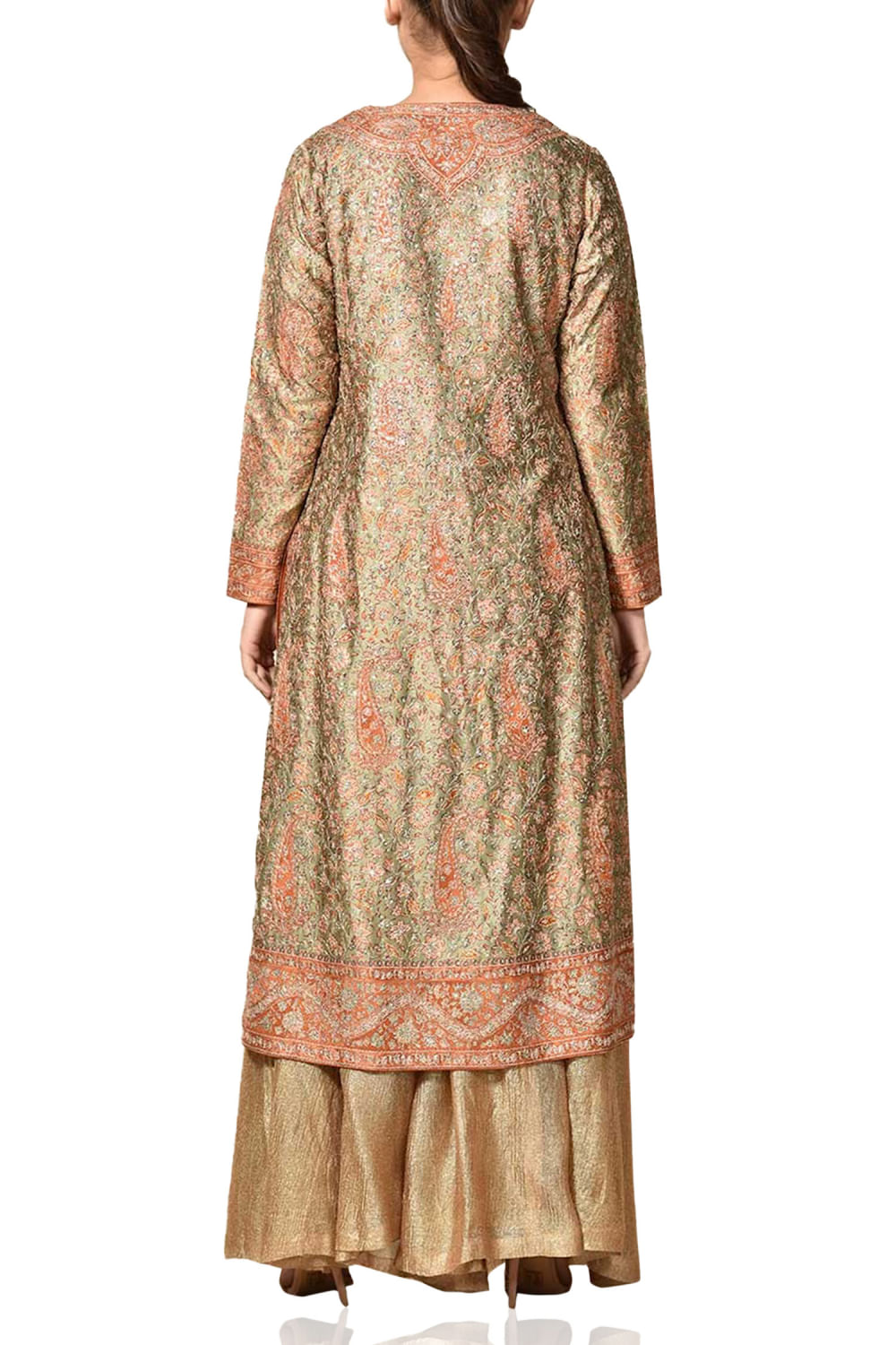 Ritu Kumar designs excel in an enchanting palette of colors featuring an orange embroidered kurta paired with palazzo and a duo-colored dupatta. Style the look with gold chandbalis and orange juttis.