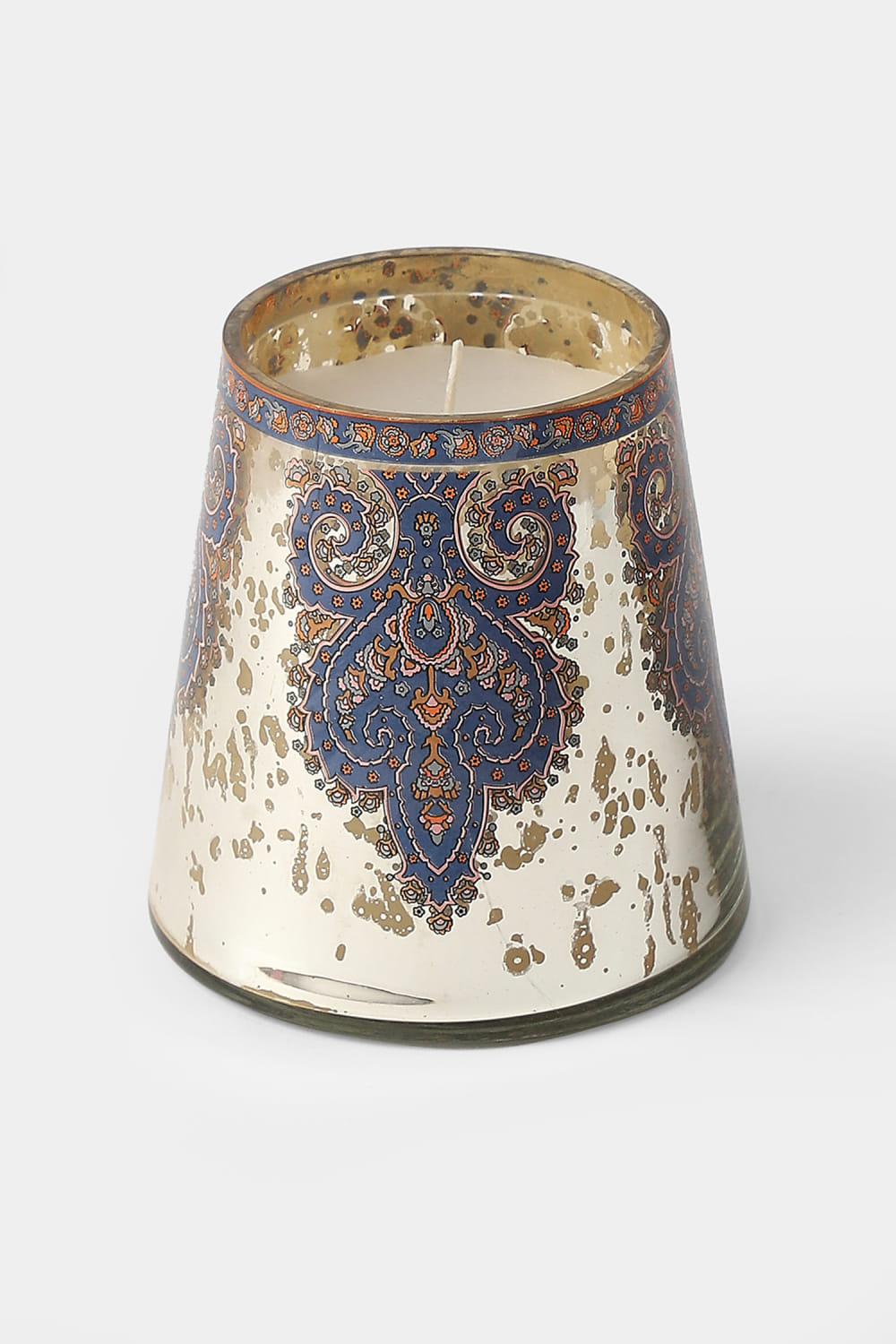 Ritu Kumar Home designs this antique glass votive customised with jamawar patterns. Complement it a contemporary decor for a party.