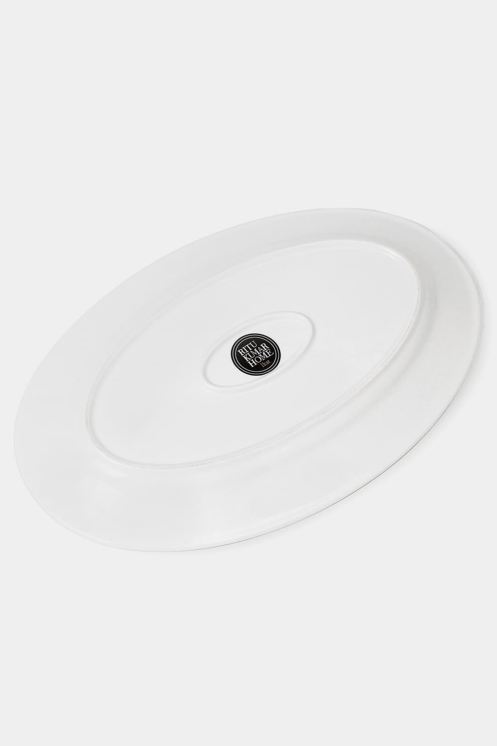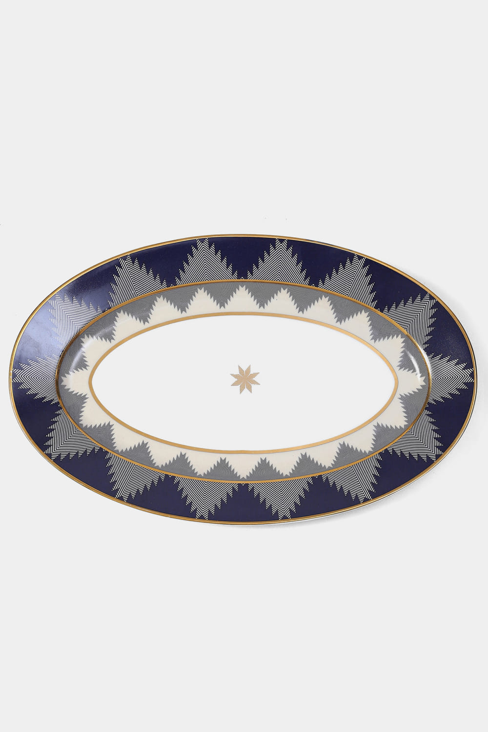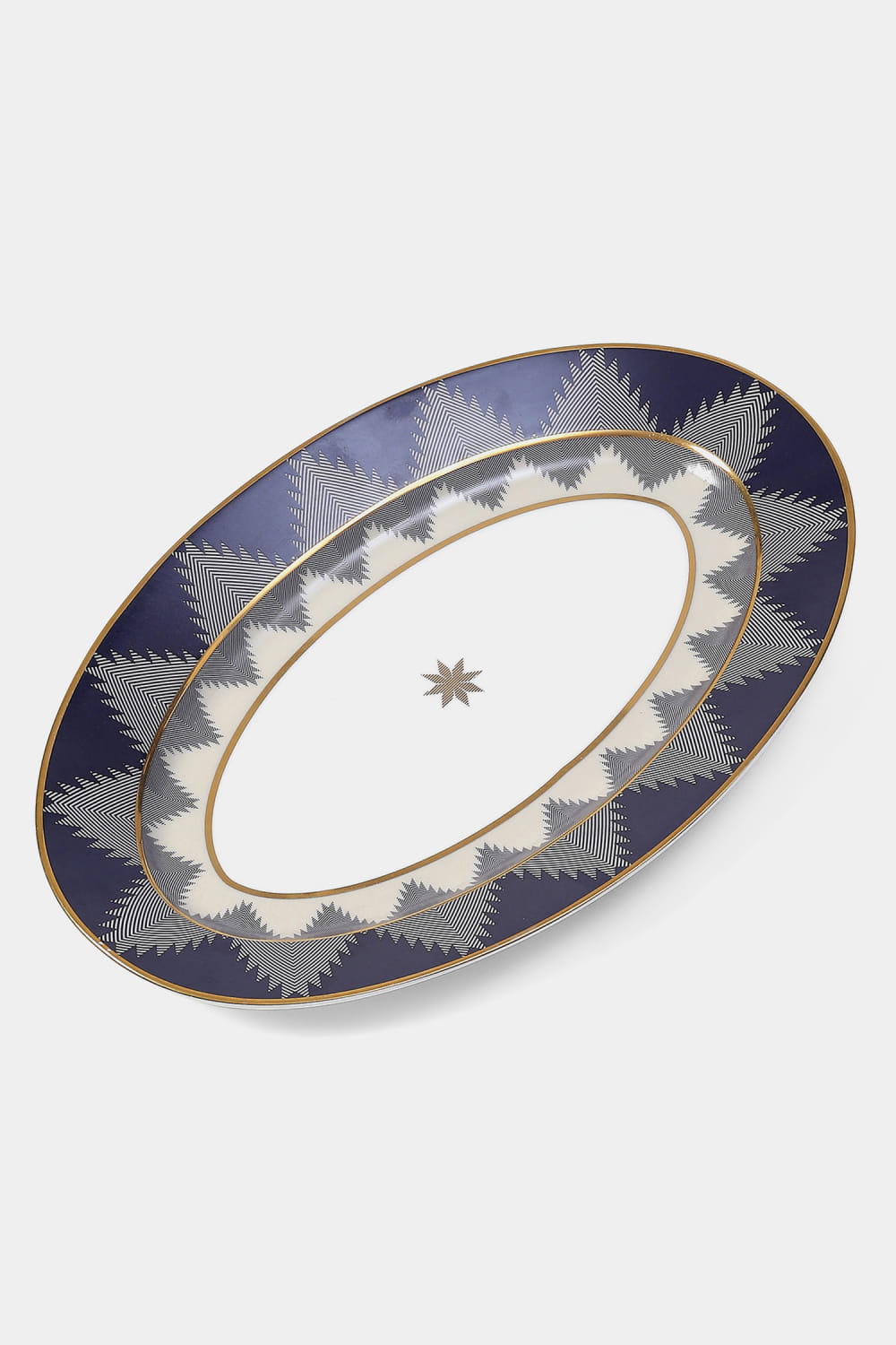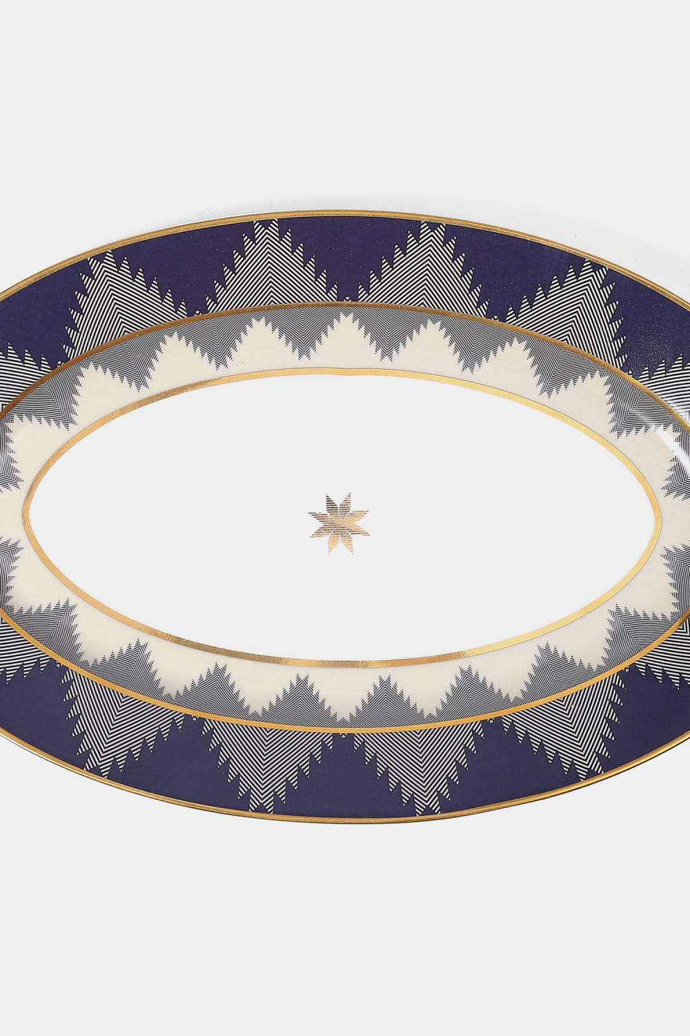 Ritu Kumar Home designs this eye-catching platter crafted in porcelain enriched with ikat print patterns featuring an oval shape. Reserve it for your upcoming party.