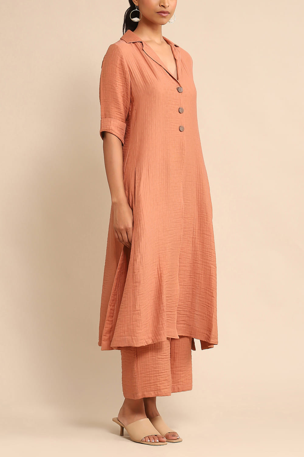 Ritu Kumar designed this everyday wear kurta crafted in cotton nylon with a notched collar and button detailing, teaming it with a pair of pants. Style the look with a cuff bracelet and slip-ons for luncheons.