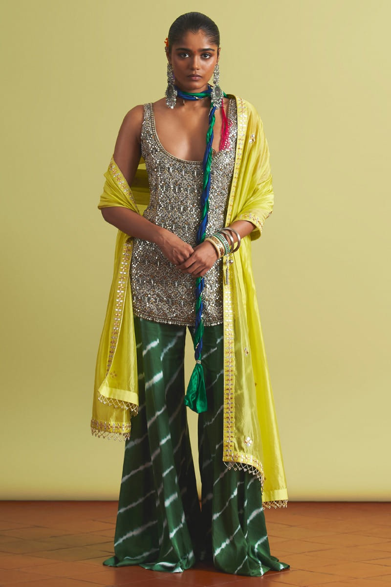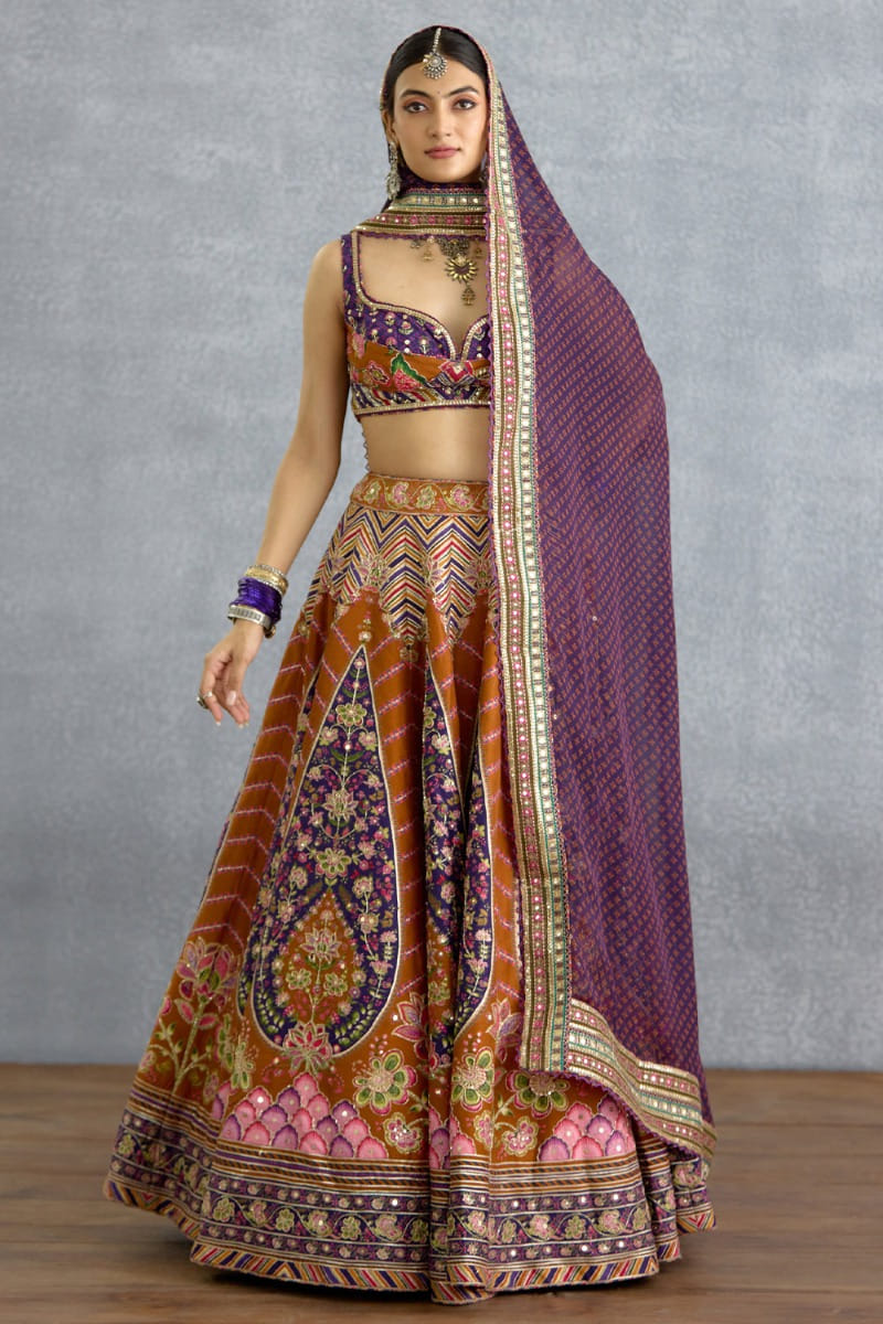 Ritu Kumar designs this flouncy lehenga and bustier blouse with artsy printed accents. The look is complemented with a printed dupatta. Style the look with a silver choker and jhumkas for a Mehendi ceremony.