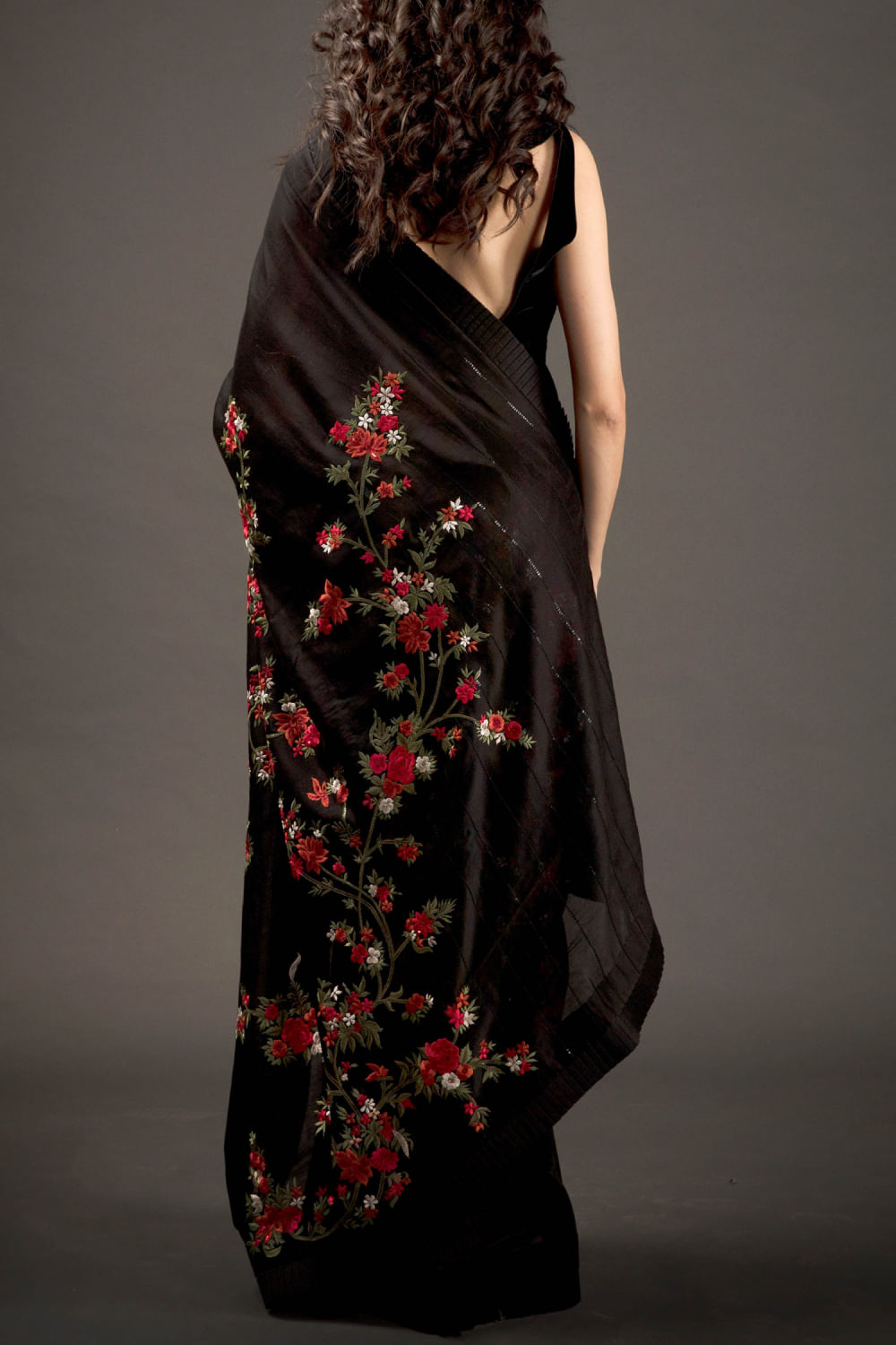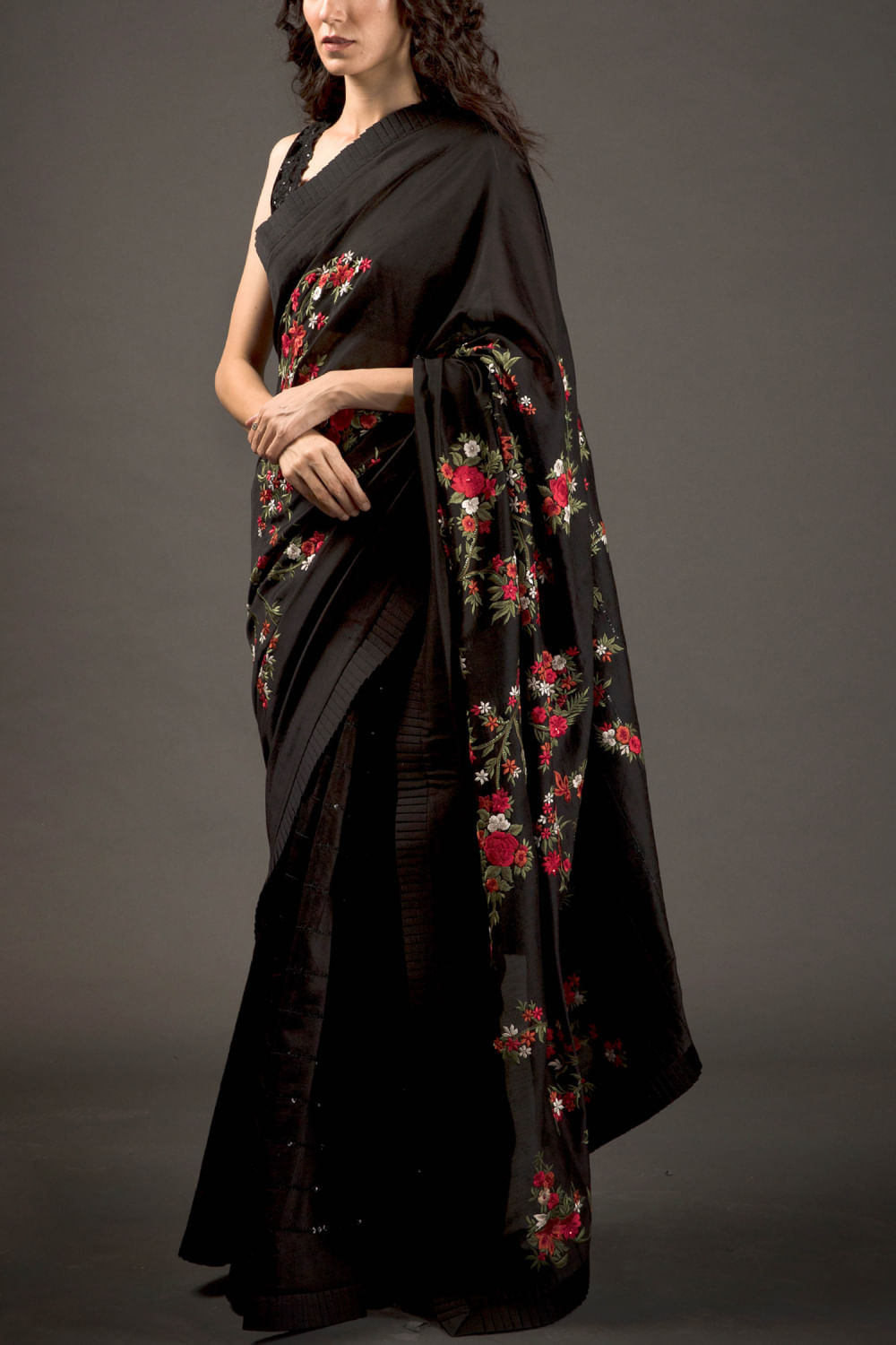 Rohit Bal designs chanderi silk sari with artsy embroidery and resham work, teaming it with an embroidered blouse fabric. Style the look with silver earrings and embellished juttis.