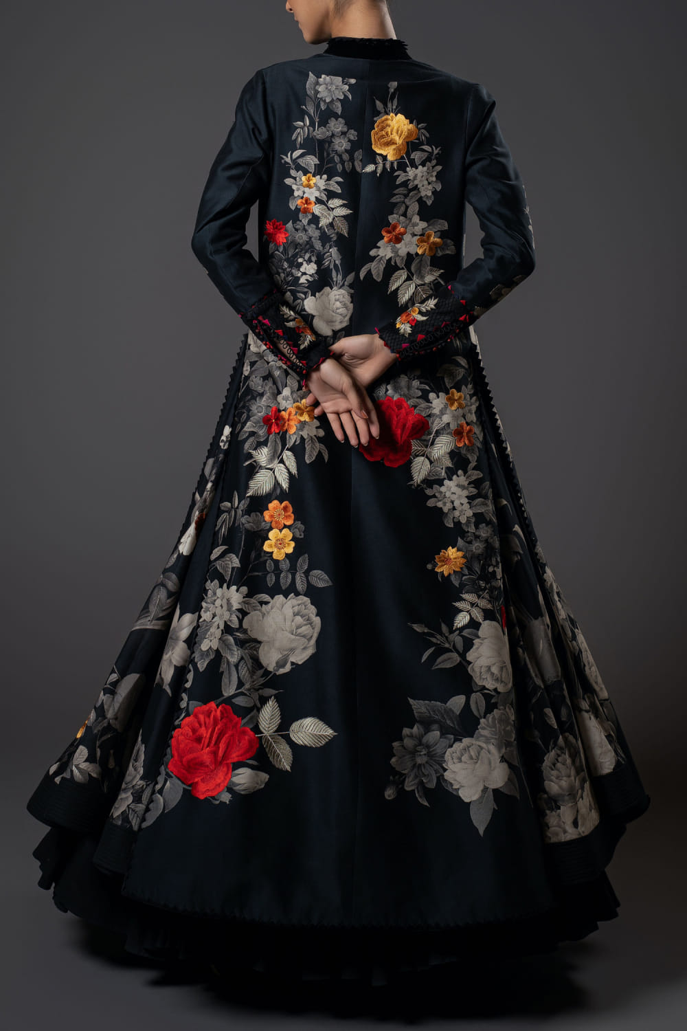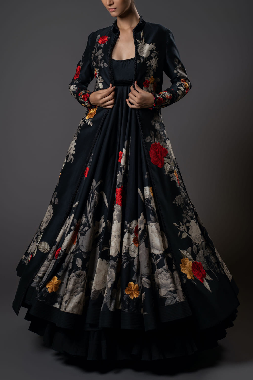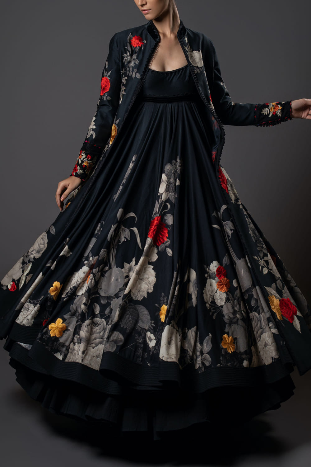 Rohit Bal designs this modish front-open jacket crafted in chanderi silk and silk velvet with floral digital prints and placement resham embroidery in floral patterns. Style it with a tissue anarkali set for a sophisticated look. The anarkali and can-can skirt here are shown for styling purposes only.
