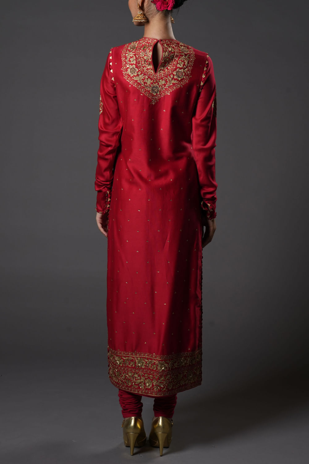 Rohit Bal designs this stunning kurta customised in chanderi silk with zari embroidery detailing in motifs and floral patterns, teaming it with a matching dupatta and a matching churidar. Style the look with embellished chandbalis and mule wedges for a wedding update.