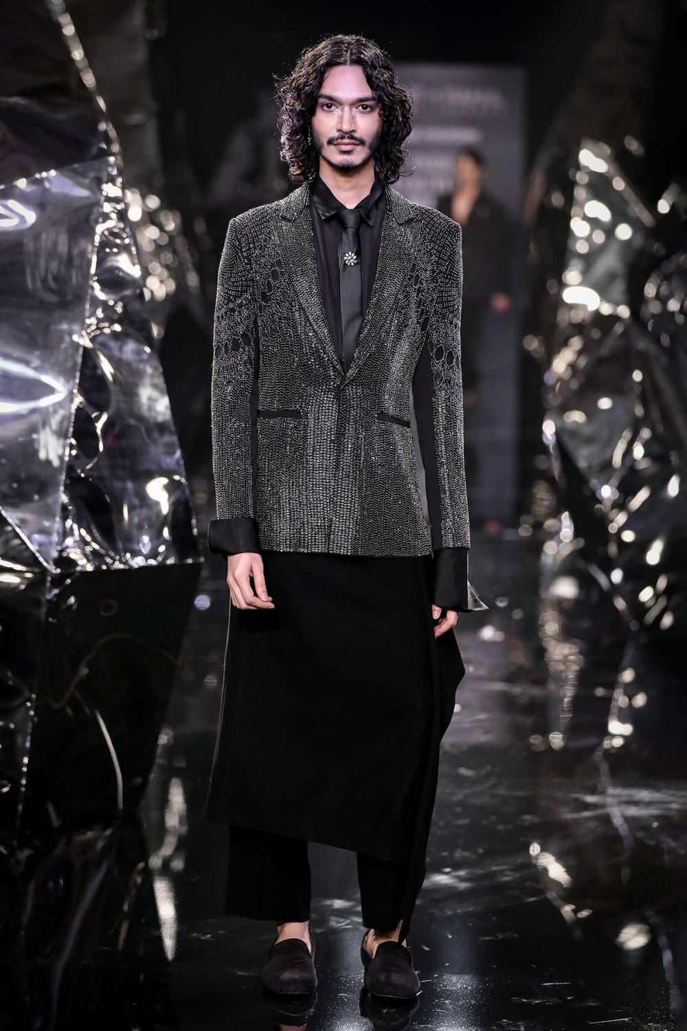 Rohit Gandhi + Rahul Khanna introduces this sophisticated black jacket, meticulously handcrafted with semi-sheer metallic fabric, metal threads, crystals, and cut beads forming an all-over geometric grid. Elevate the look by pairing it with slim-fit black trousers and patent leather shoes for a contemporary and polished appearance. The trousers shown here are for styling purposes only.