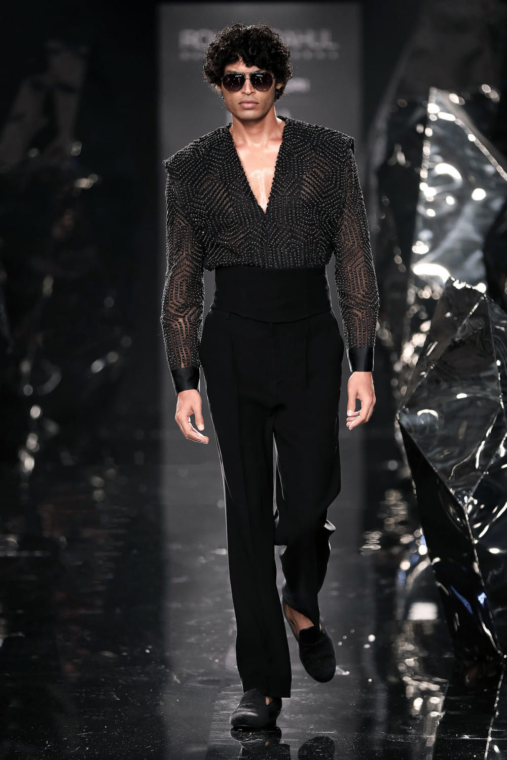 Rohit Gandhi + Rahul Khanna introduces the sophisticated black Hexi spiral structured jacket, adorned with a mesmerizing maze of silk fray units arranged in a spiral formation and highlighted with metallic cut beads. Elevate your style by pairing it with tailored trousers for a polished ensemble, suitable for formal events and celebrations. The pants here are shown for styling purposes only.