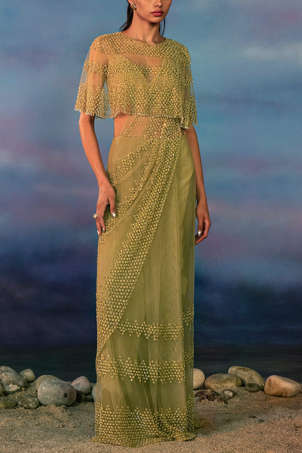Rohit Gandhi + Rahul Khanna designs this striking cape embraced in viscose crepe customised with tonal 3D embellishments in geometric patterns featuring crystal tassel detailing, complementing it with a matching embellished pre-stitched draped tulle sari and a matching embellished strappy blouse. Style the look with chandelier earrings and an embellished clutch for a dinner soiree.