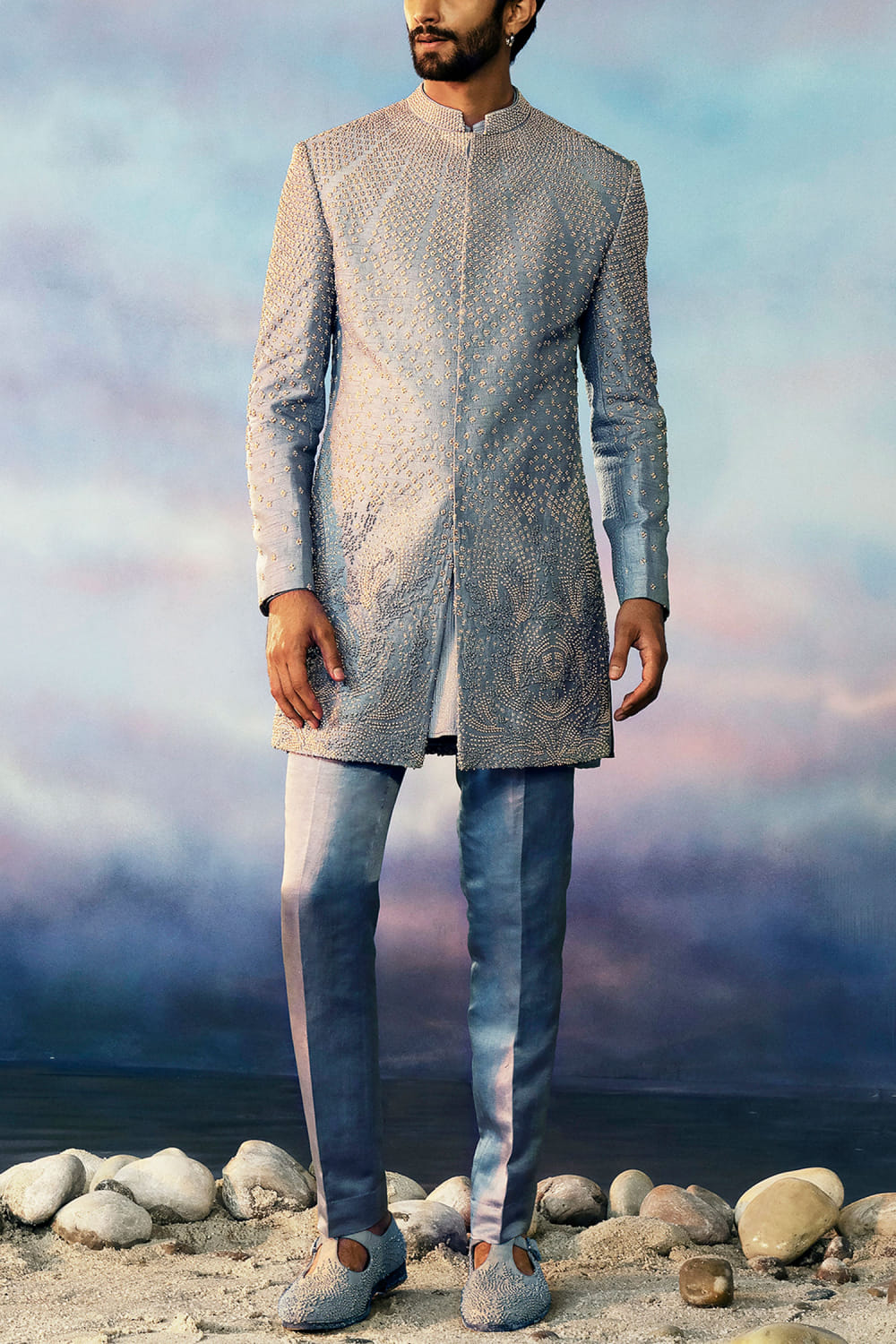 Rohit Gandhi + Rahul Khanna designs a blingy look with this viscose dupion sherwani enhanced with silk thread work, pearl detailing and metallic highlights in geometric patterns, teaming it with a matching silk kurta. Style the look with matching pants and embellished mespads for a wedding affair. The pants here are shown for styling purposes only.