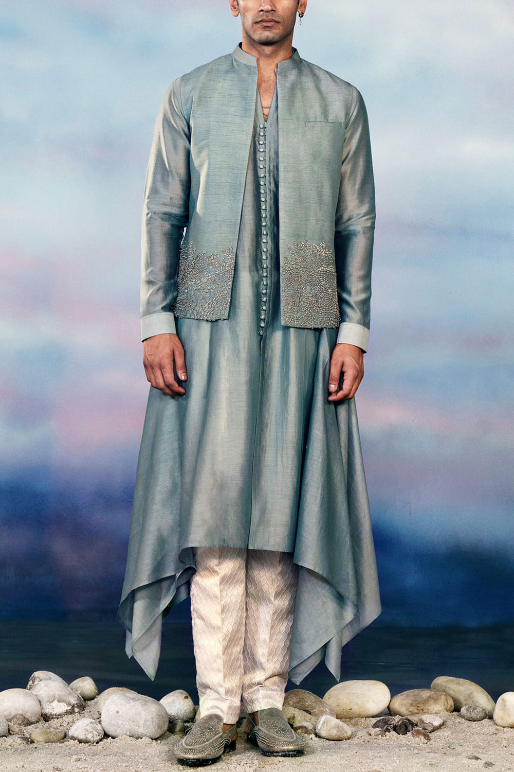 Rohit Gandhi + Rahul Khanna designs this striking waist jacket accentuated with beads, metallic wire and silk thread work paired with a matching asymmetrical kurta. Style the look with a stole and linen pants. The pants here are shown for styling purposes only.