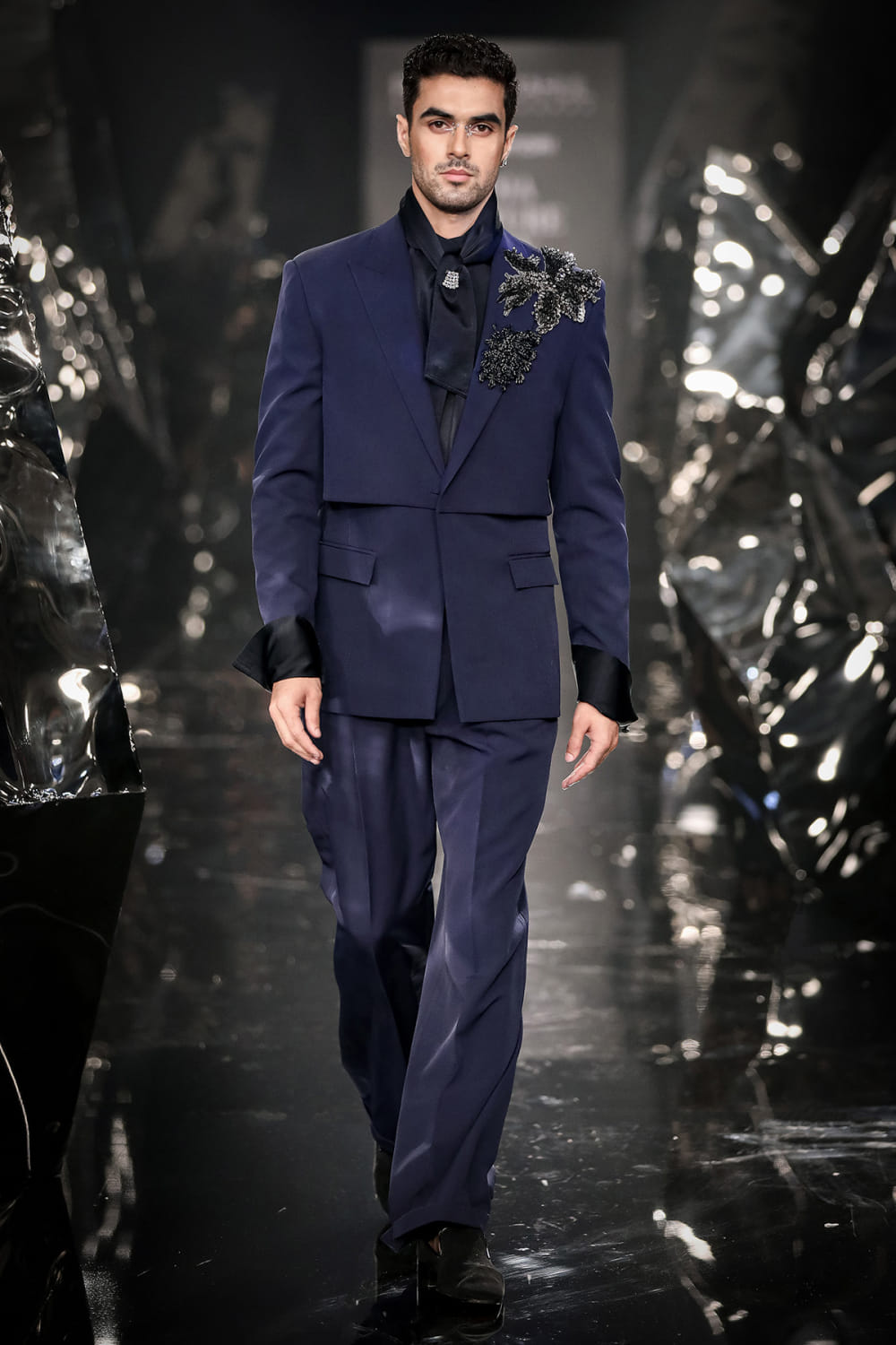 Rohit Gandhi + Rahul Khanna introduces this stunning pacific blue jacket, featuring a double-layer contoured design adorned with handcrafted 3D flowers done in tonal crystal, metallic sequin, and cut beads placed around the shoulders. Elevate the look by pairing it with leather shoes for a modern and sophisticated appearance. The trousers shown here are for styling purposes only.