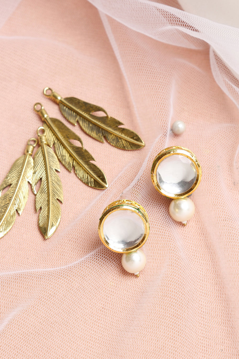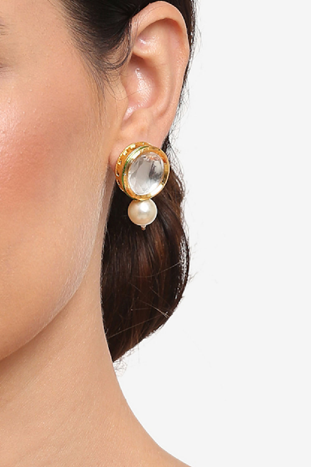 Ruby Raang designs this glossy pair of earrings customised in brass and alloy studded with faux kundan, faux pearls and faux stone embellishments. Style them with a gathered kurta set for intimate festivities.