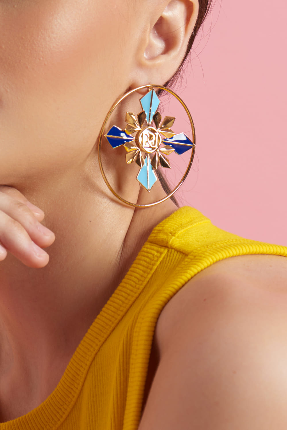Ruhette designs this charming pair of chic round stud earrings enriched with enamel and mirror detailing. Crafted in 20k gold plating on brass. Style them with an off-shoulder top.