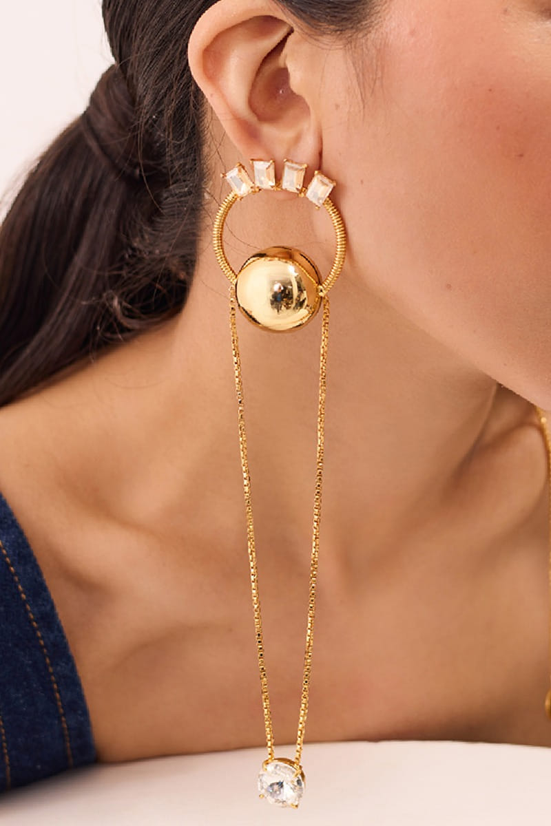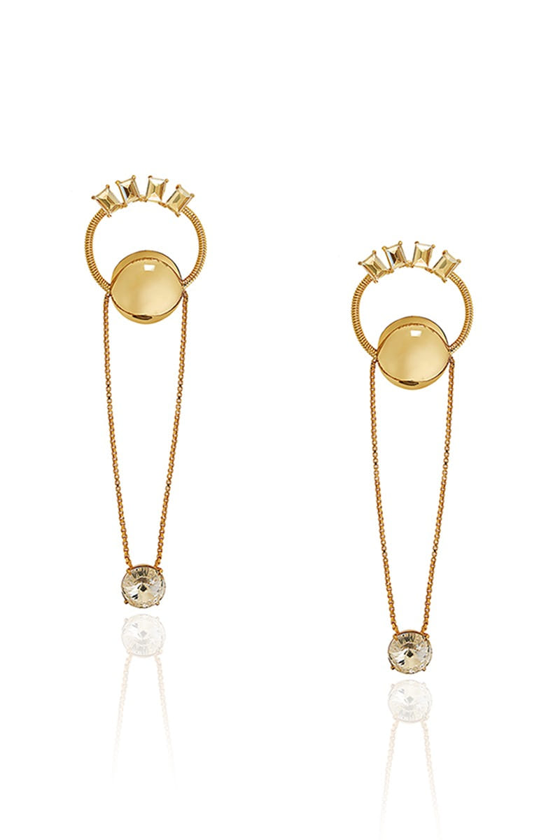 Ruhette designs this distinctive pair of earrings crafted in 22kt gold-plated brass laden with Swarovski crystal embellishments featuring chain detailing and round shapes. Style them with a cape set for a glamorous look.