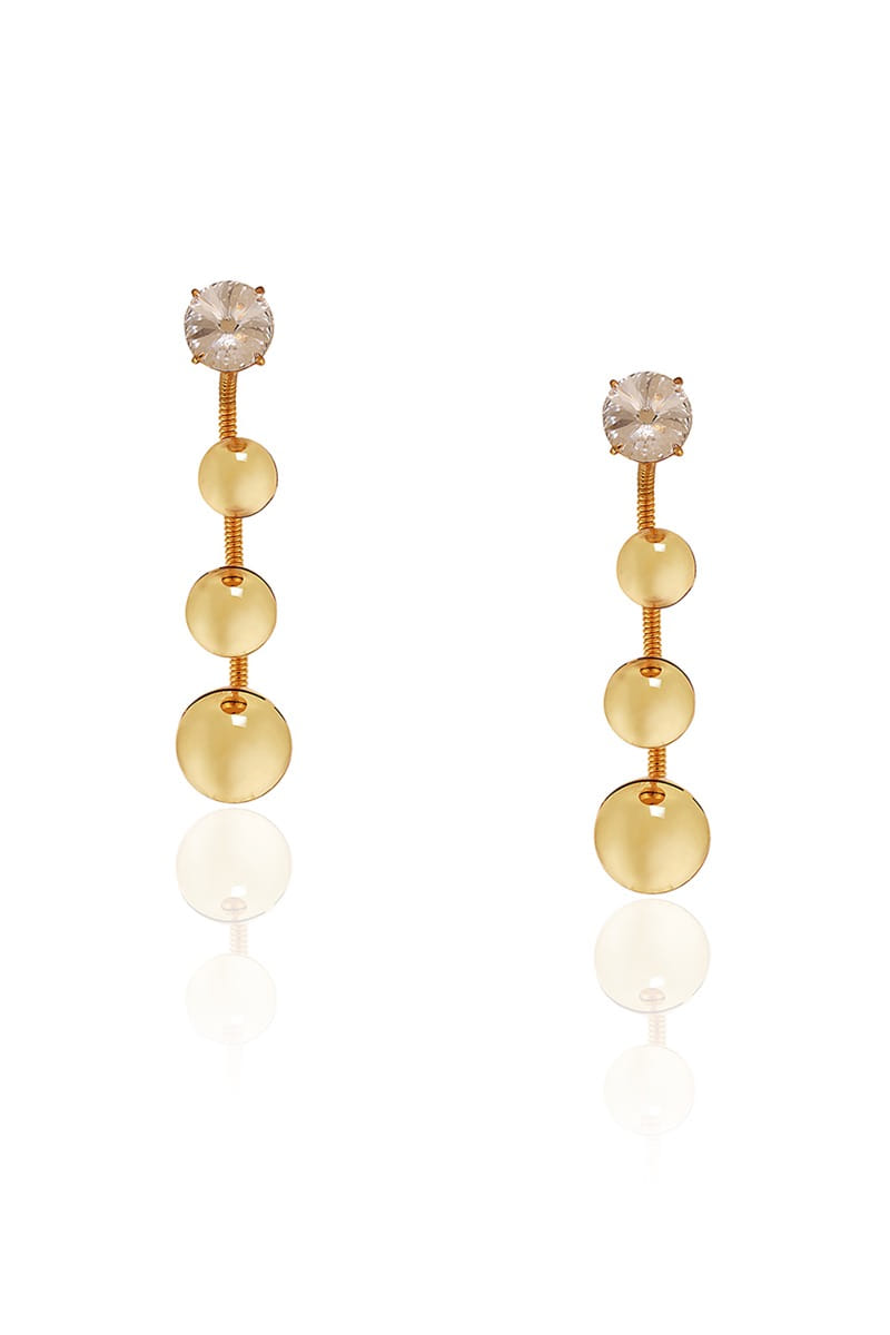 Ruhette designs this timeless pair of earrings customised in 22kt gold-plated brass embedded with Swarovski crystal embellishments featuring coil spring texture detailing and round shapes. Style them with a draped kaftan for a soiree.