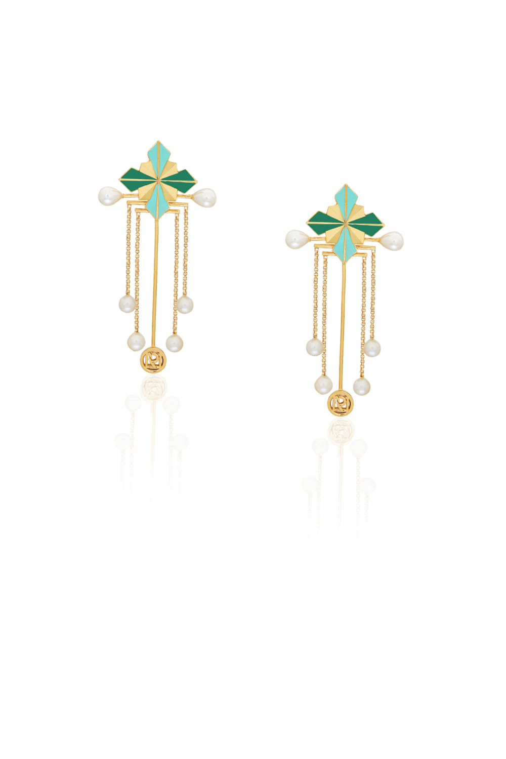 Ruhette designs this statement-making pair of danglers crafted in 20k gold plating on brass enriched with enamel and mirror detailing featuring a delicate pearl drop accent. Style them with a contemporary ensemble for the occasion.
