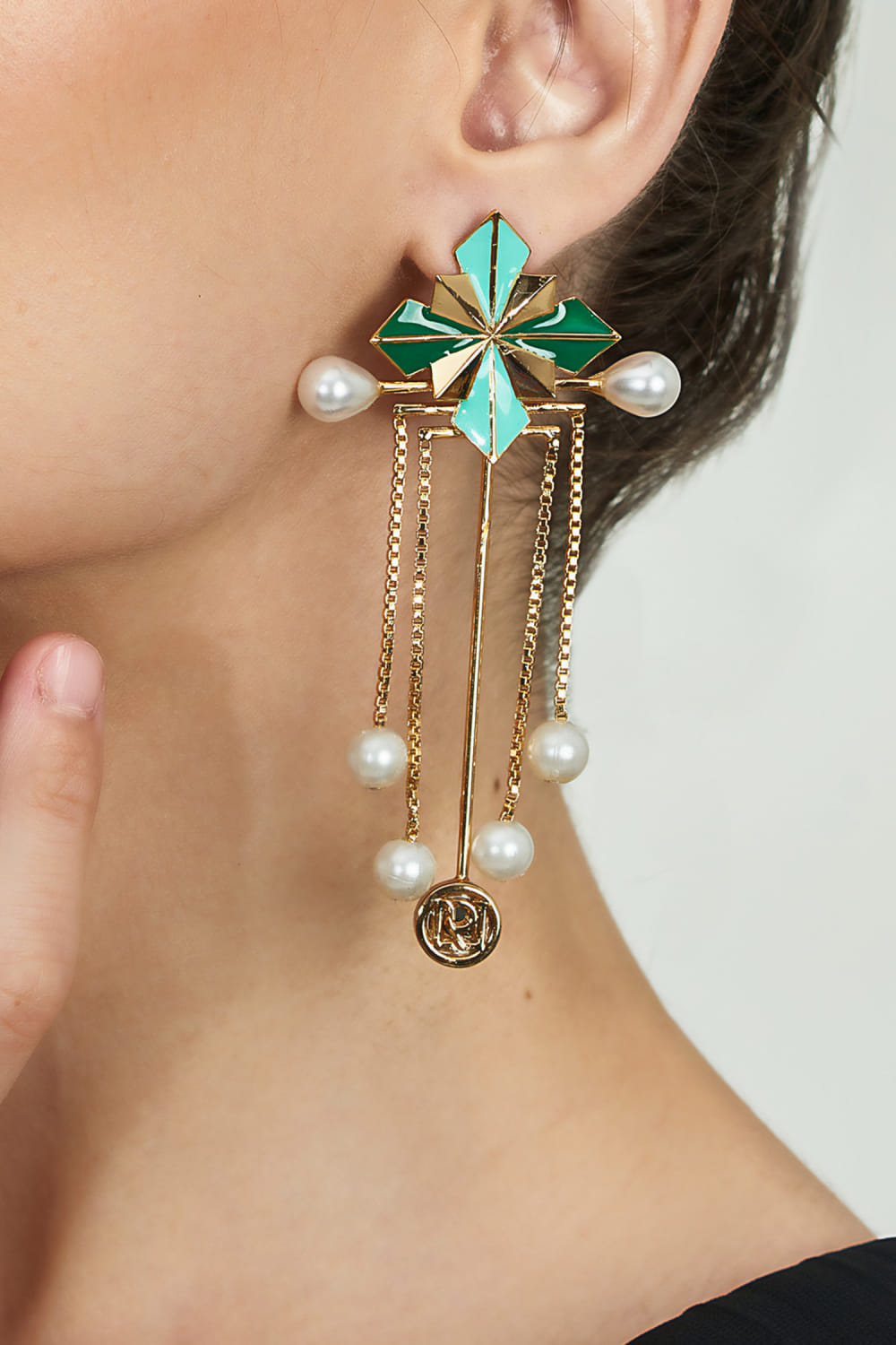 Green pearl and enamel embellished danglers