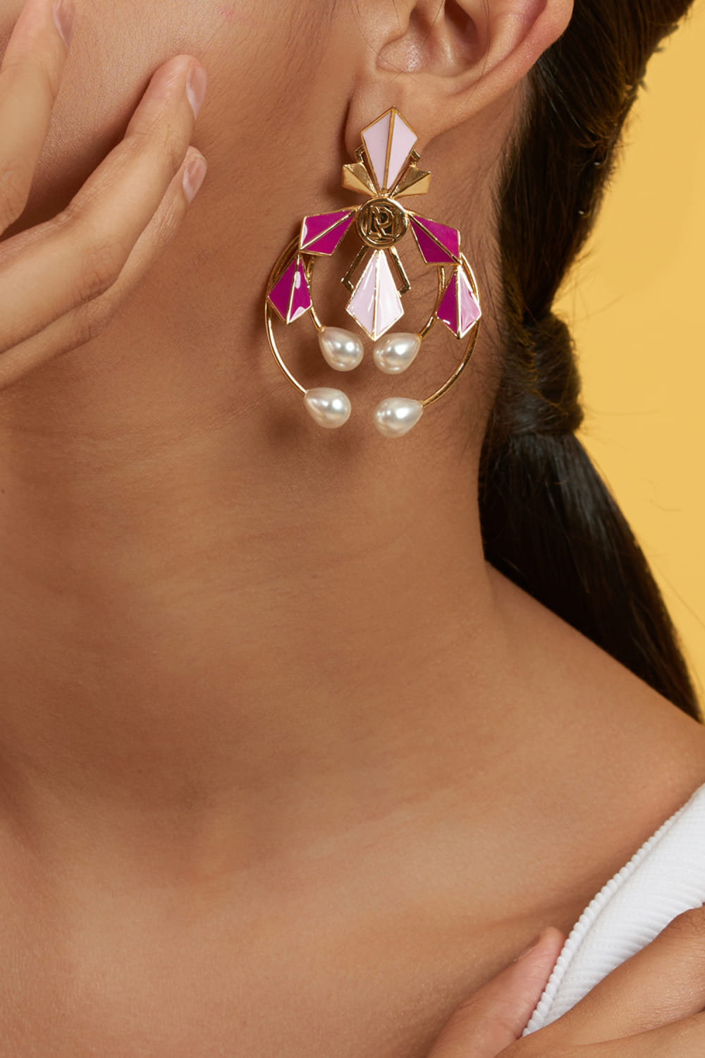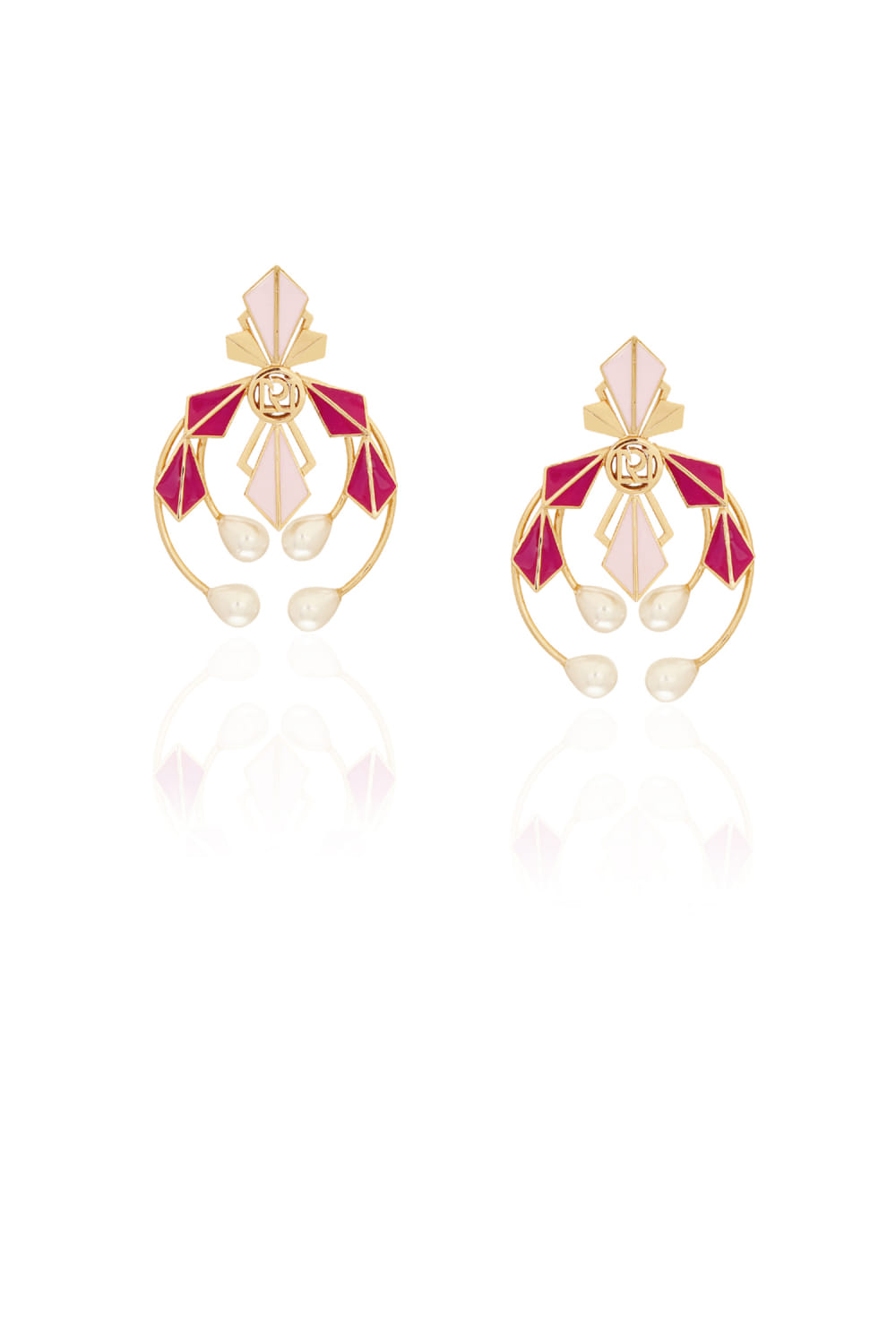 Ruhette designs this contemporary pair of earrings crafted in 20k gold plating on brass rendered with enamel, pearl and mirror detailing. Style them with a contemporary gown for a statement look.
