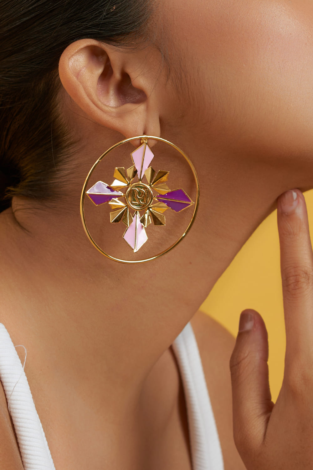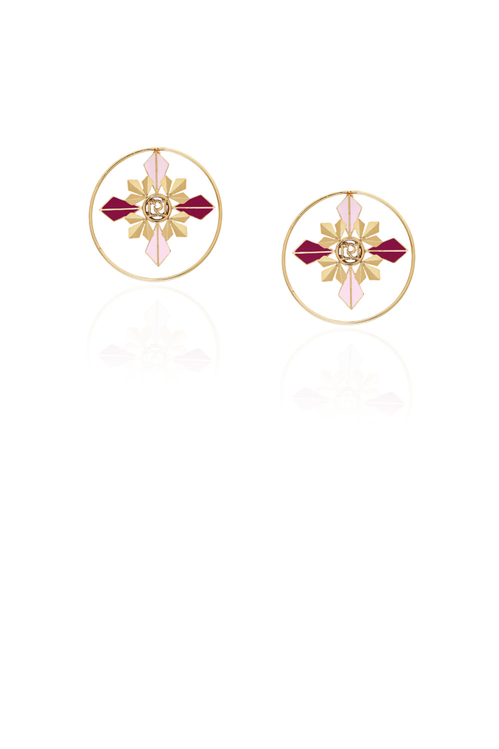 Ruhette designs this new-age pair of round stud earrings crafted in 20k gold plating on brass enhanced with enamel and mirror detailing. Style them with an edgy shirt dress.