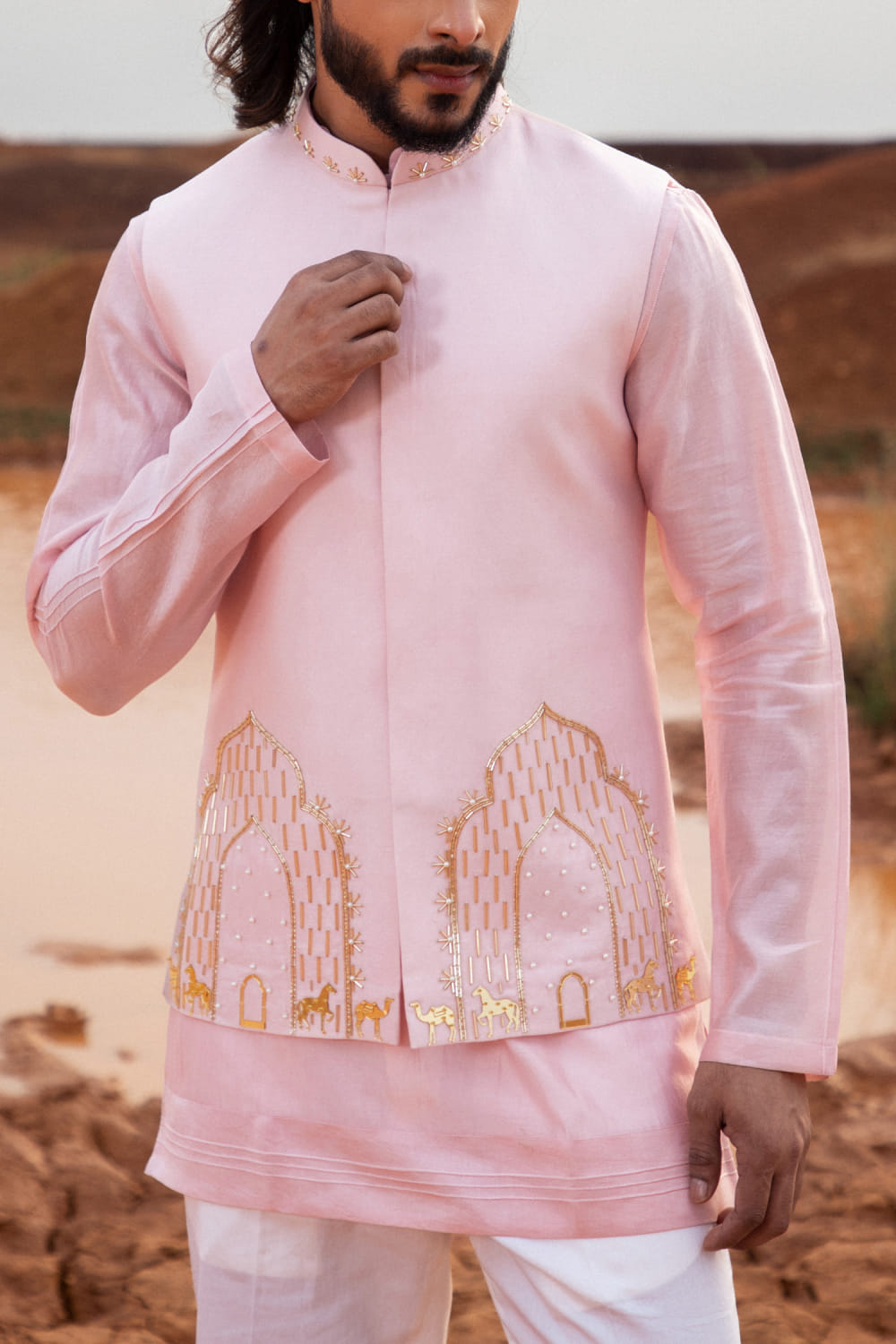 Runit Gupta designs this splendid bandi crafted in chanderi silk with cutdana, cutpipe, pearl, horse and camel gold motifs and Mughal-inspired hand embroidery detailing in a placement pattern, teaming it with a kurta and pants. Style the look with a pair of velvet mojris for a striking look.