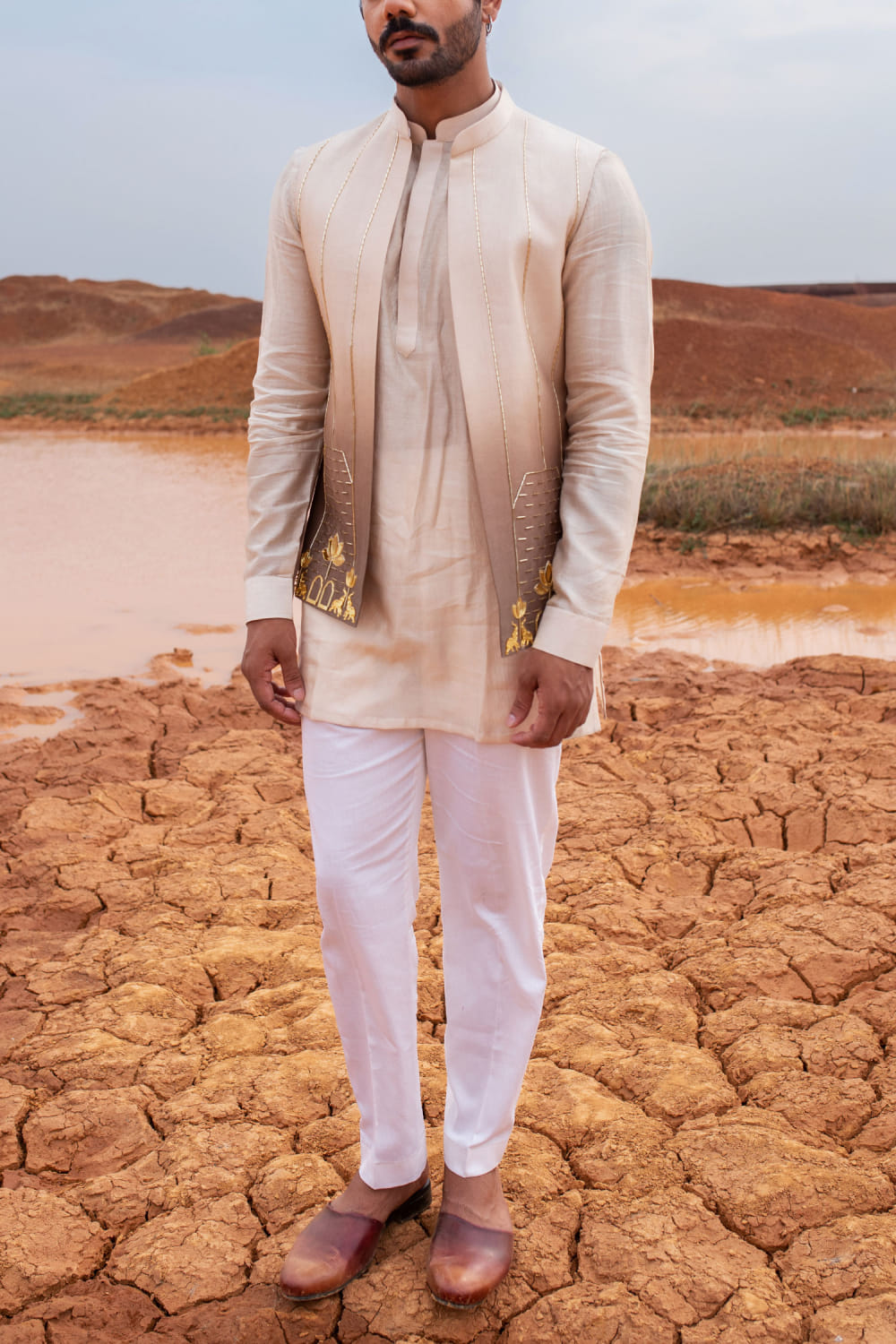 Runit Gupta designs this statement-making ombre bandi crafted in chanderi silk enriched with cutdana, elephant motifs and filigree lotus gold motifs hand embroidery detailing in placement patterns, teamed with a kurta and pants. Style the look with velvet loafers for the occasion.