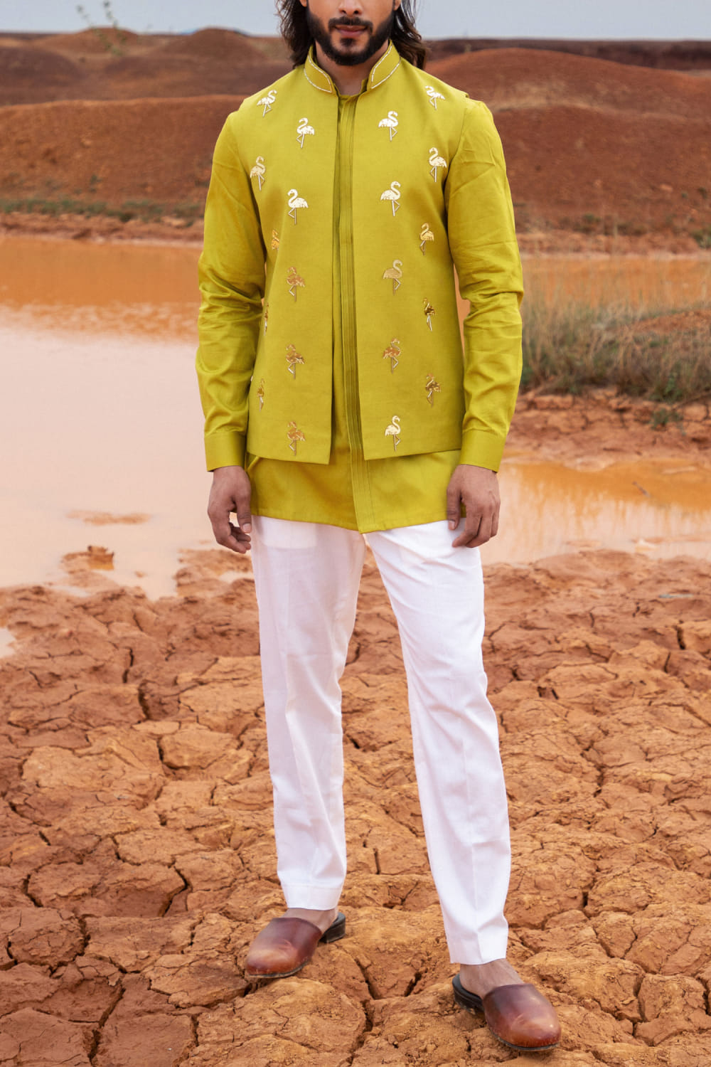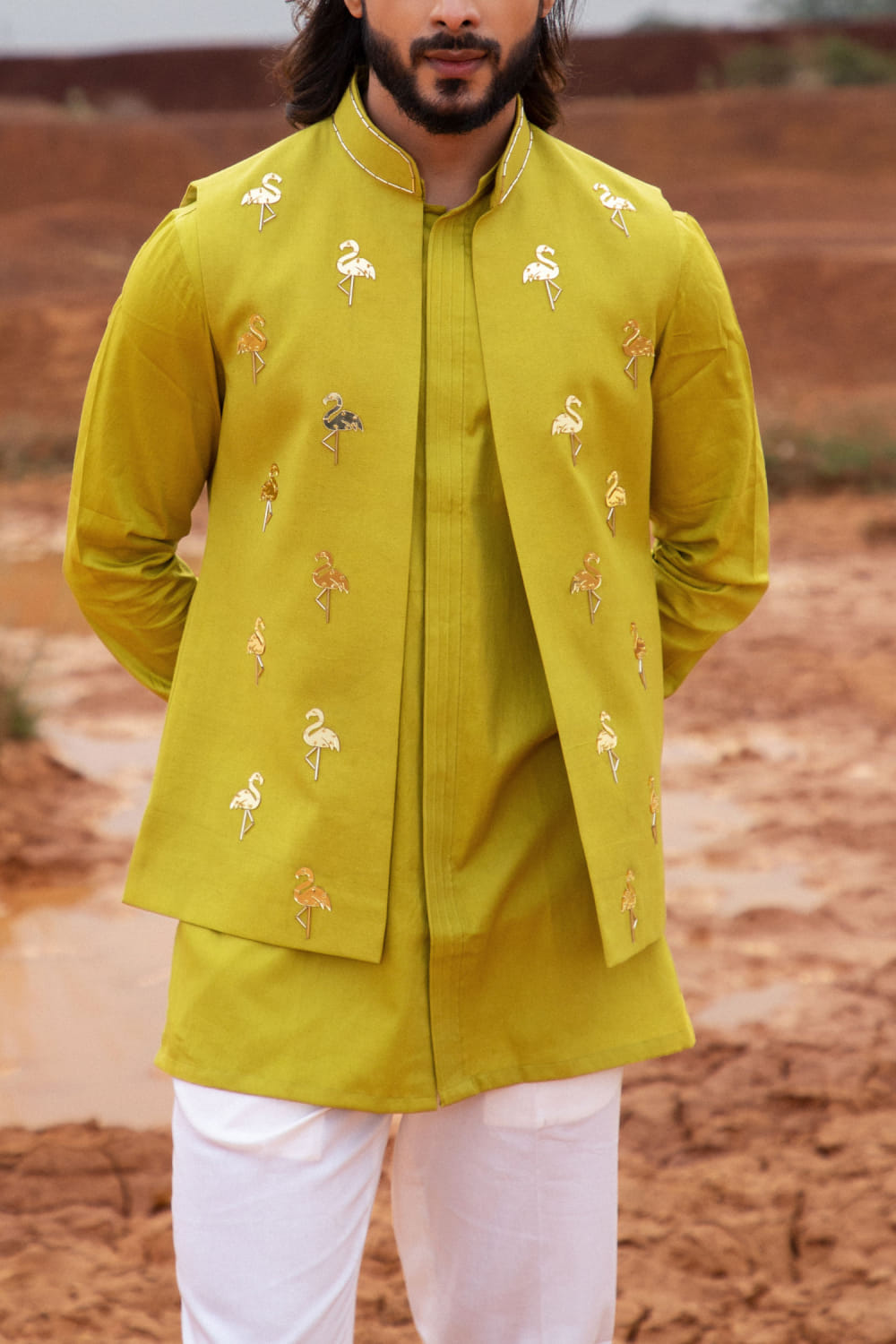 Runit Gupta designs this eye-catching bandi in chanderi silk enhanced with cutdana and flamingo gold motifs hand embroidery detailing in placement patterns, teaming it with a matching buttoned kurta and pants. Style the look with embellished mules for the party.