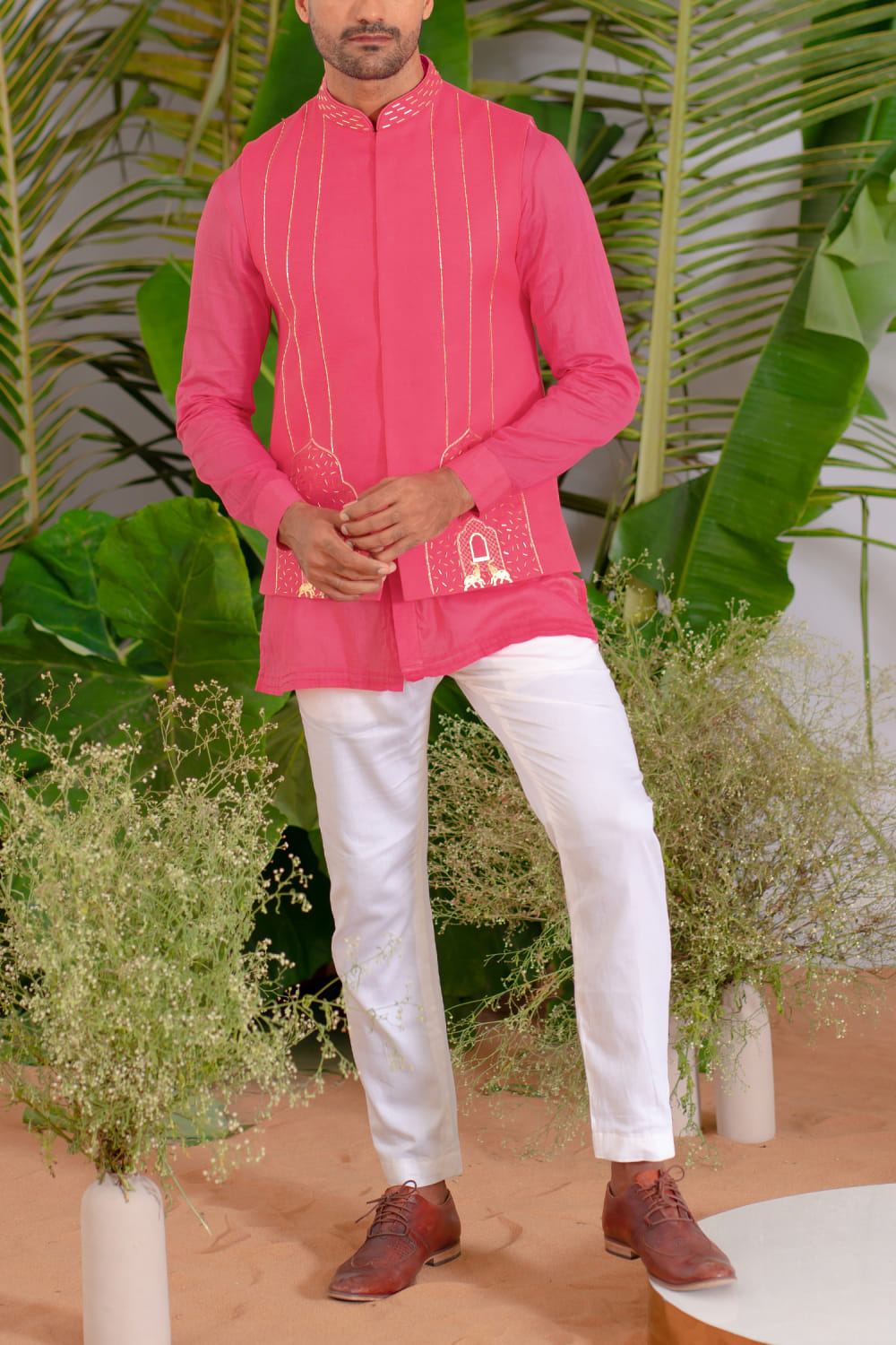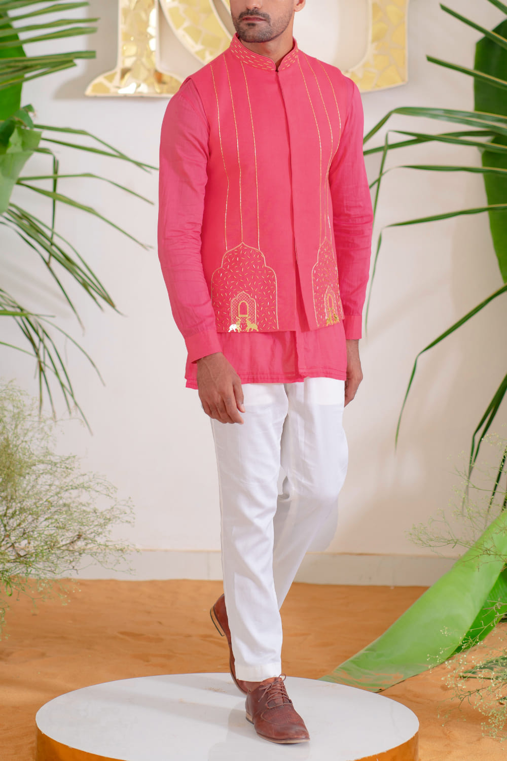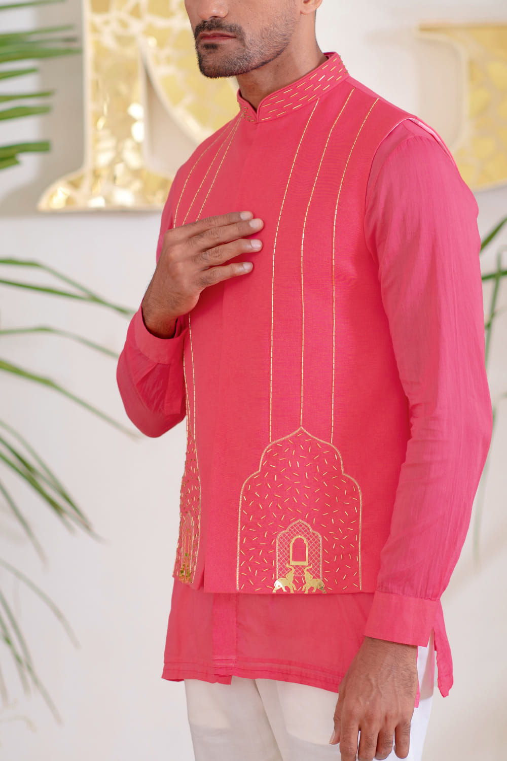 Runit Gupta designs this eye-catching bandi crafted in chanderi silk with cutdana and elephant gold motifs and Mughal-inspired hand embroidery detailing in a placement pattern, teaming it with a kurta and pants. Style the look with a pair of leather loafers for a party.