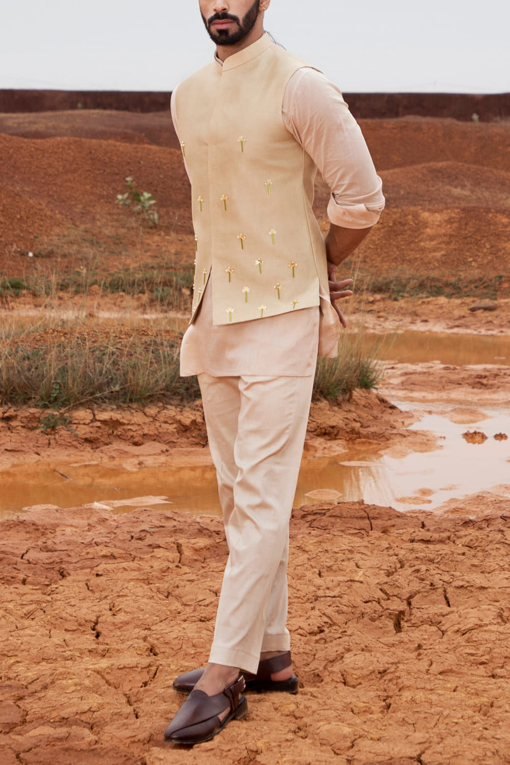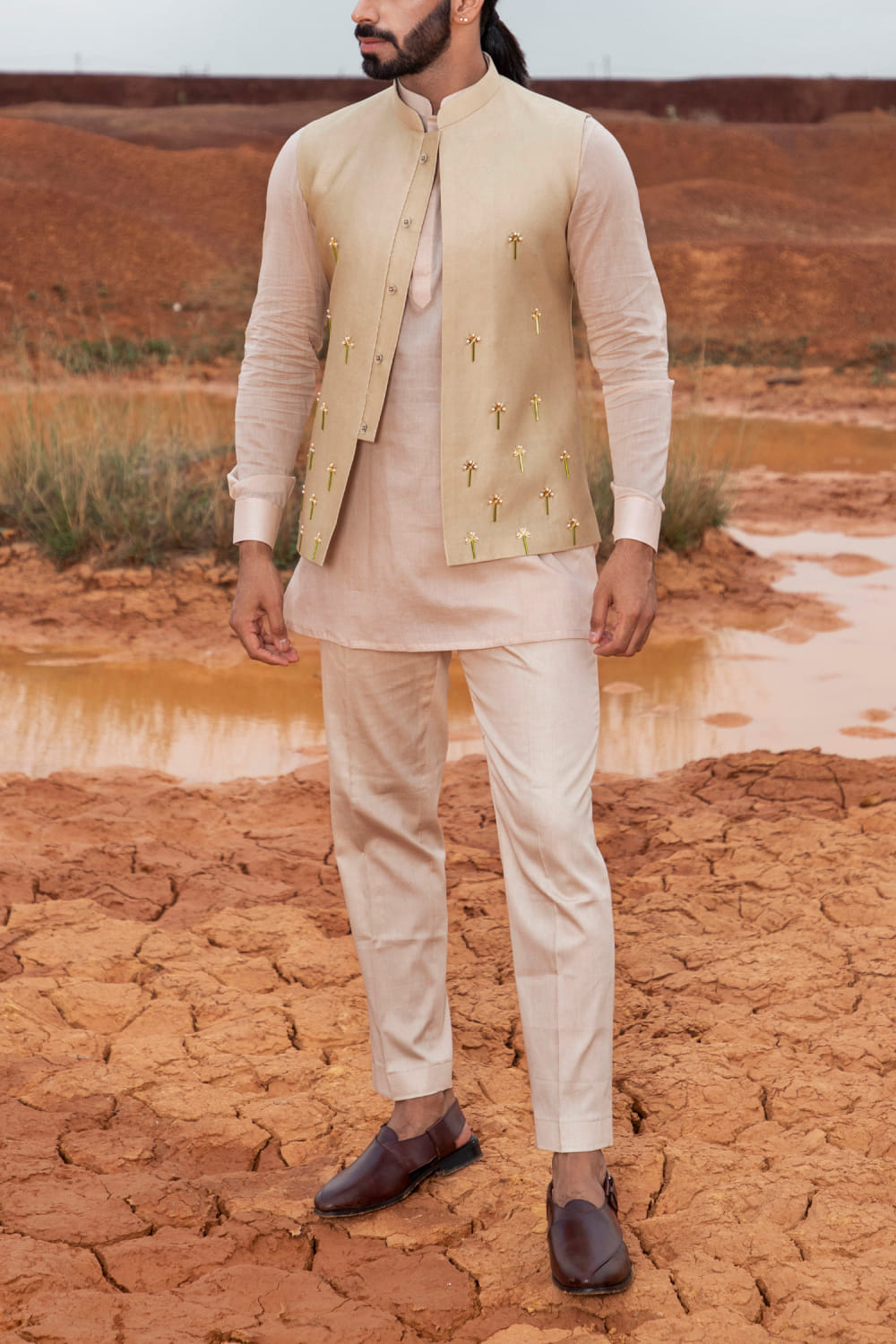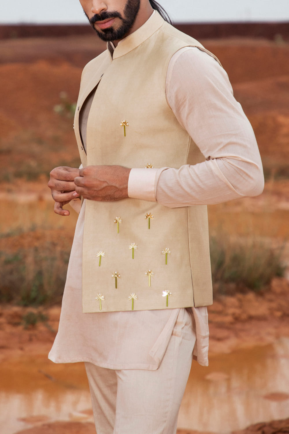 Runit Gupta designs this modern bandi crafted in chanderi silk with cutpipe, pearl and gold motifs hand embroidery detailing in a placement pattern, teamed with a kurta and pants. Style the look with a pair of texture woven loafers.