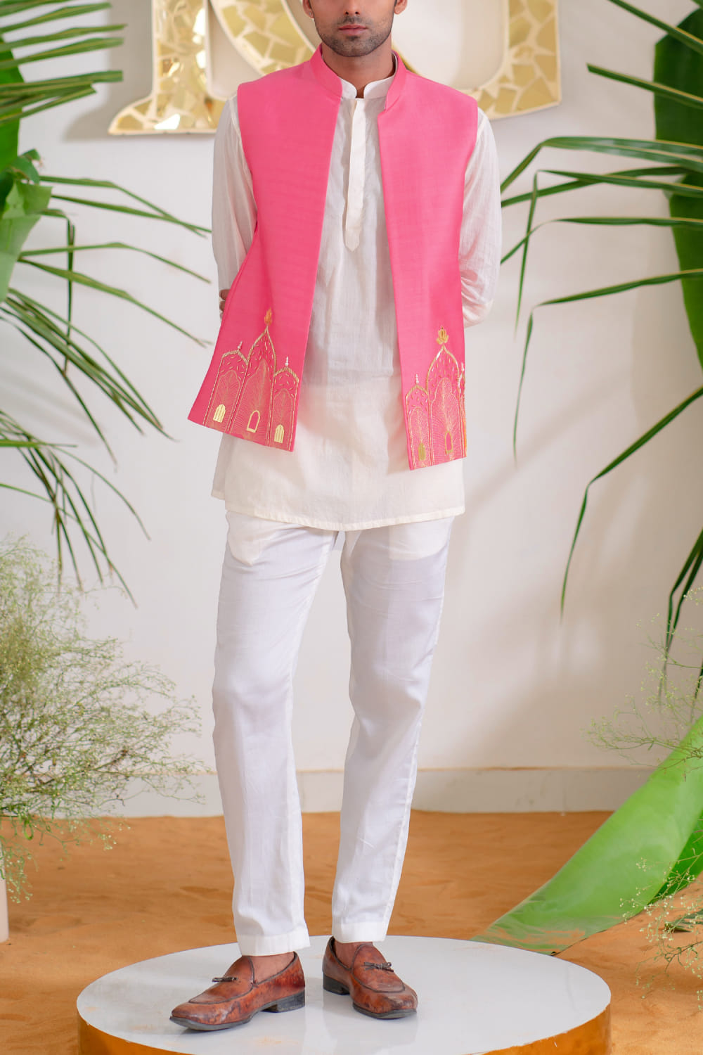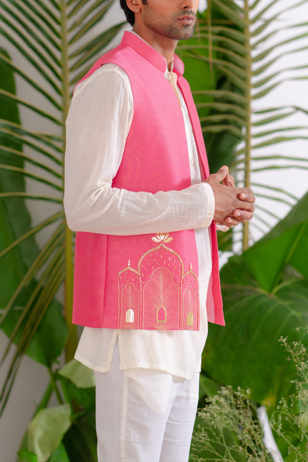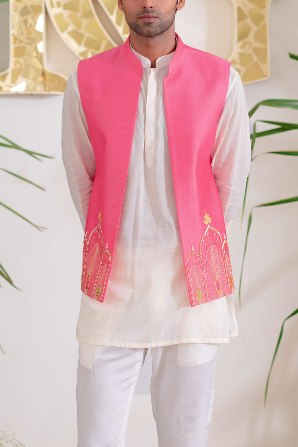 Runit Gupta designs this impeccably fashionable bandi crafted in chanderi silk with cutdana, zari work, pearl, lotus gold motifs and Mughal-inspired hand embroidery detailing in a placement pattern, teaming it with a kurta and pants. Style the look with an embellished mojris for a statement look.