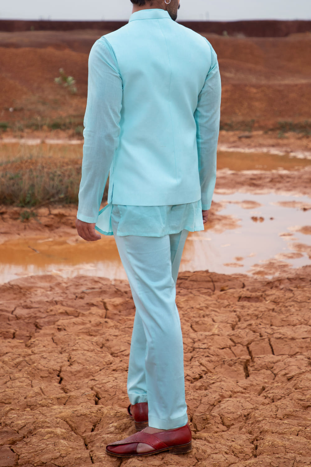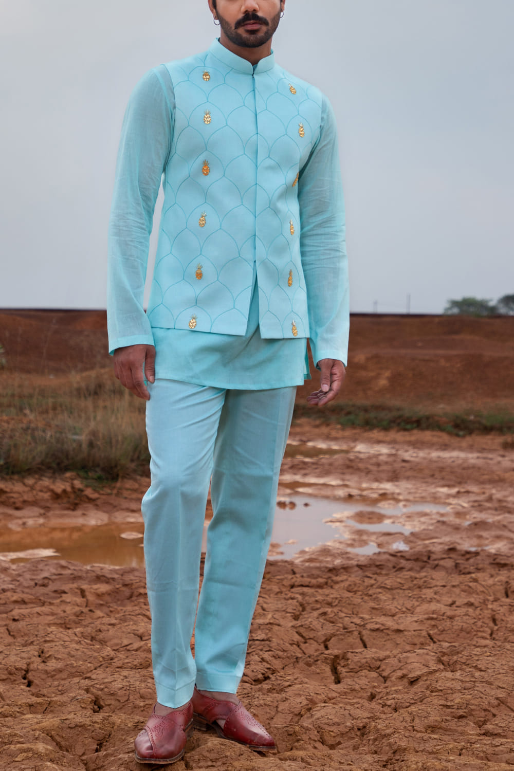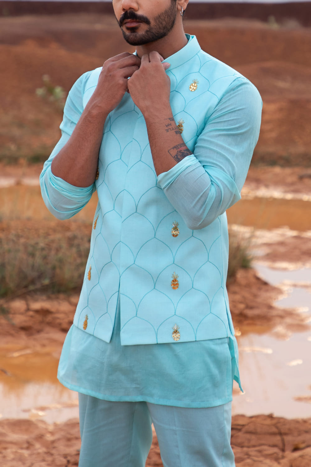 Runit Gupta designs this eye-catching bandi crafted in cotton linen with resham thread detailing and pineapple gold motifs hand embroidery detailing in a placement pattern, teamed with a kurta and pants. Style the look with a pair of leather sandals.