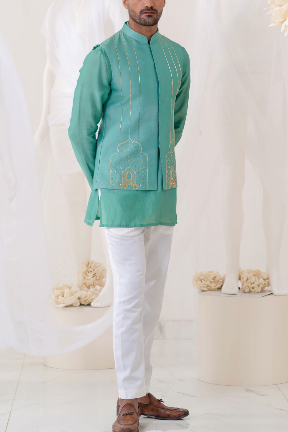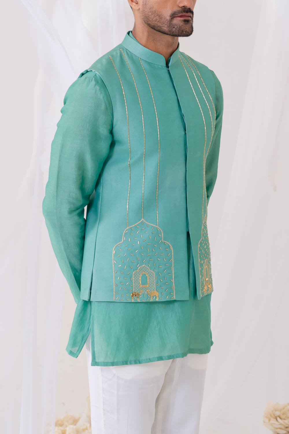 Runit Gupta designs this vintage-inspired bandi fabricated in chanderi silk accentuated with cutdana, camel motifs and Mughal-inspired gold motifs hand embroidery detailing, teamed with a matching kurta and pants. Style the look with a pair of embroidered mules for a festive vibe.