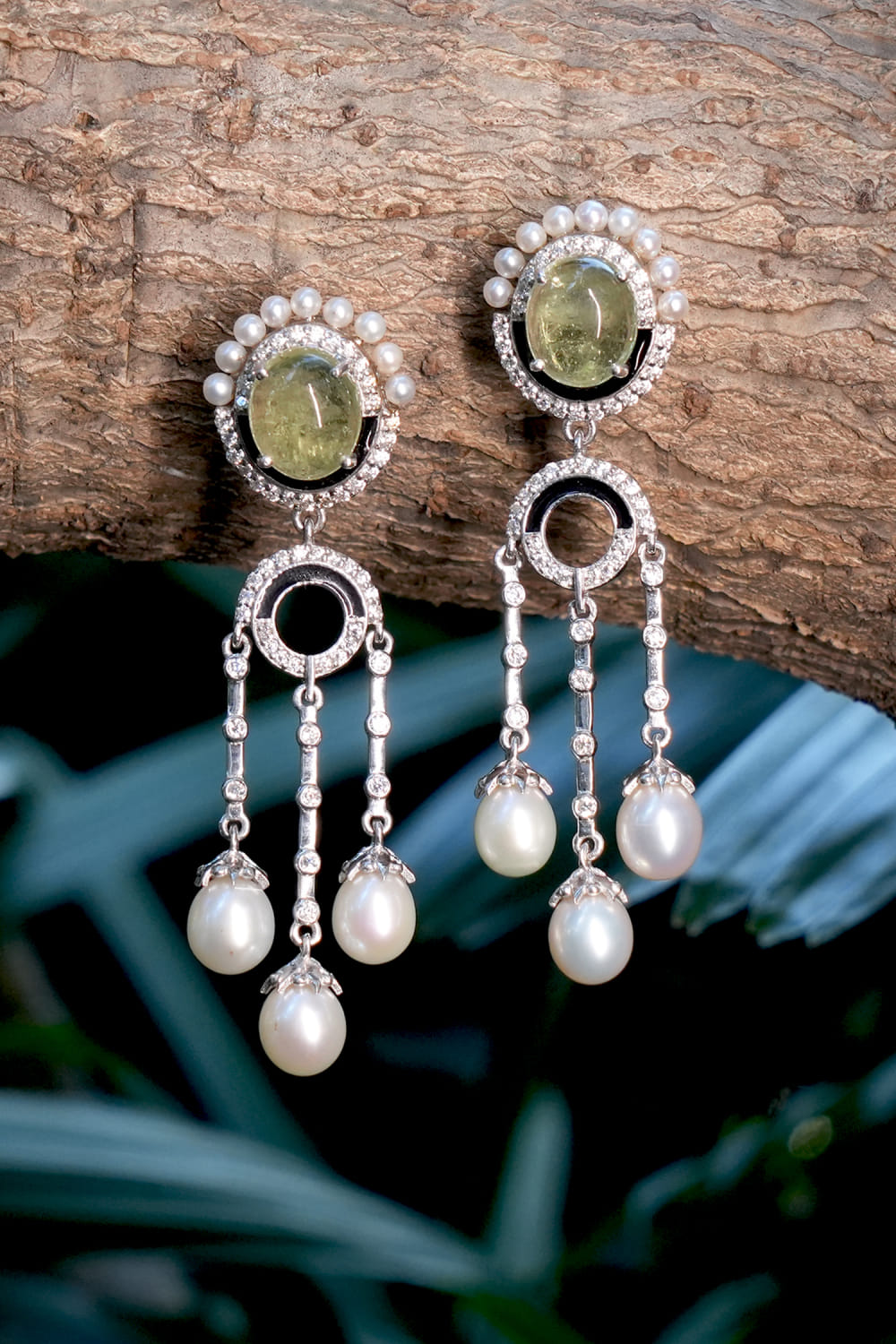 Green and white peridot and pearl danglers