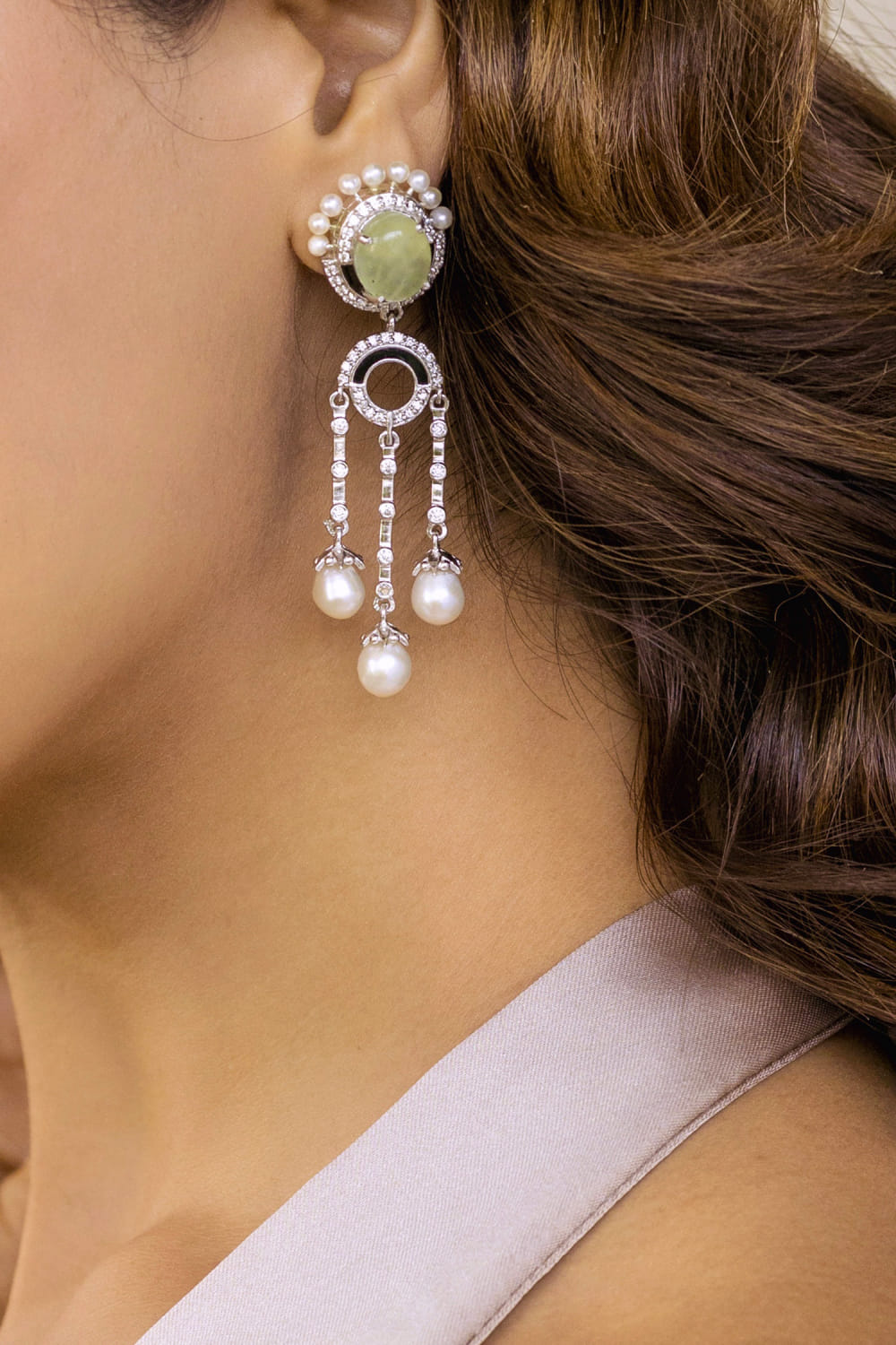 Ruuh Studios designs this scintillating pair of danglers customised in white rhodium-plated 925 silver encrusted with freshwater pearls, prehenite and moissanite embellishments. Style them with a satin dress for a chic appeal.