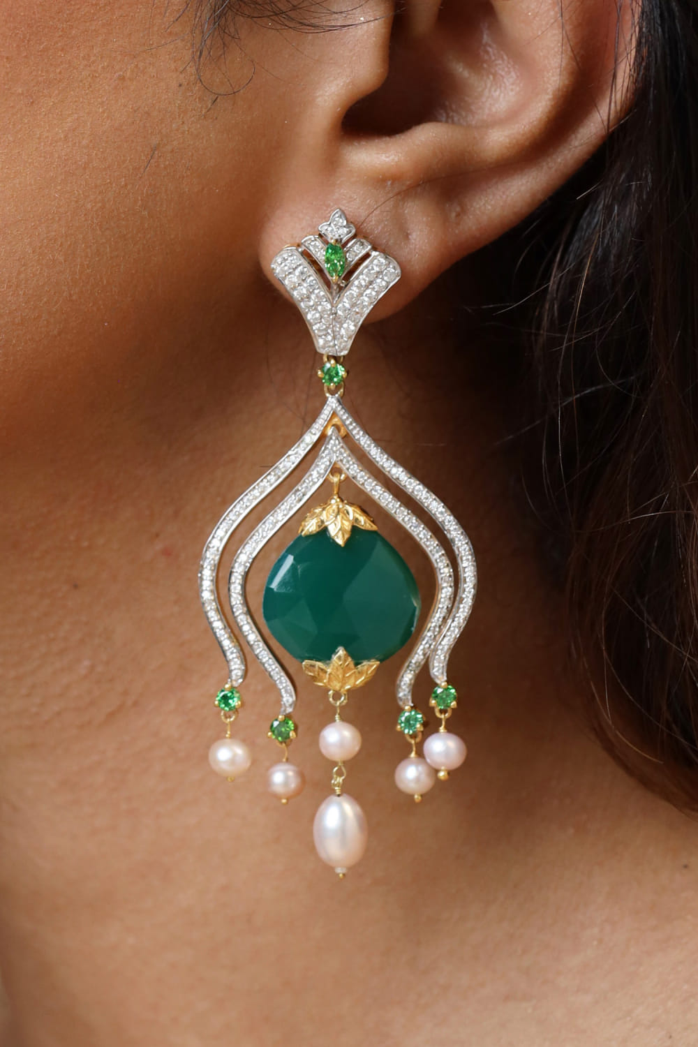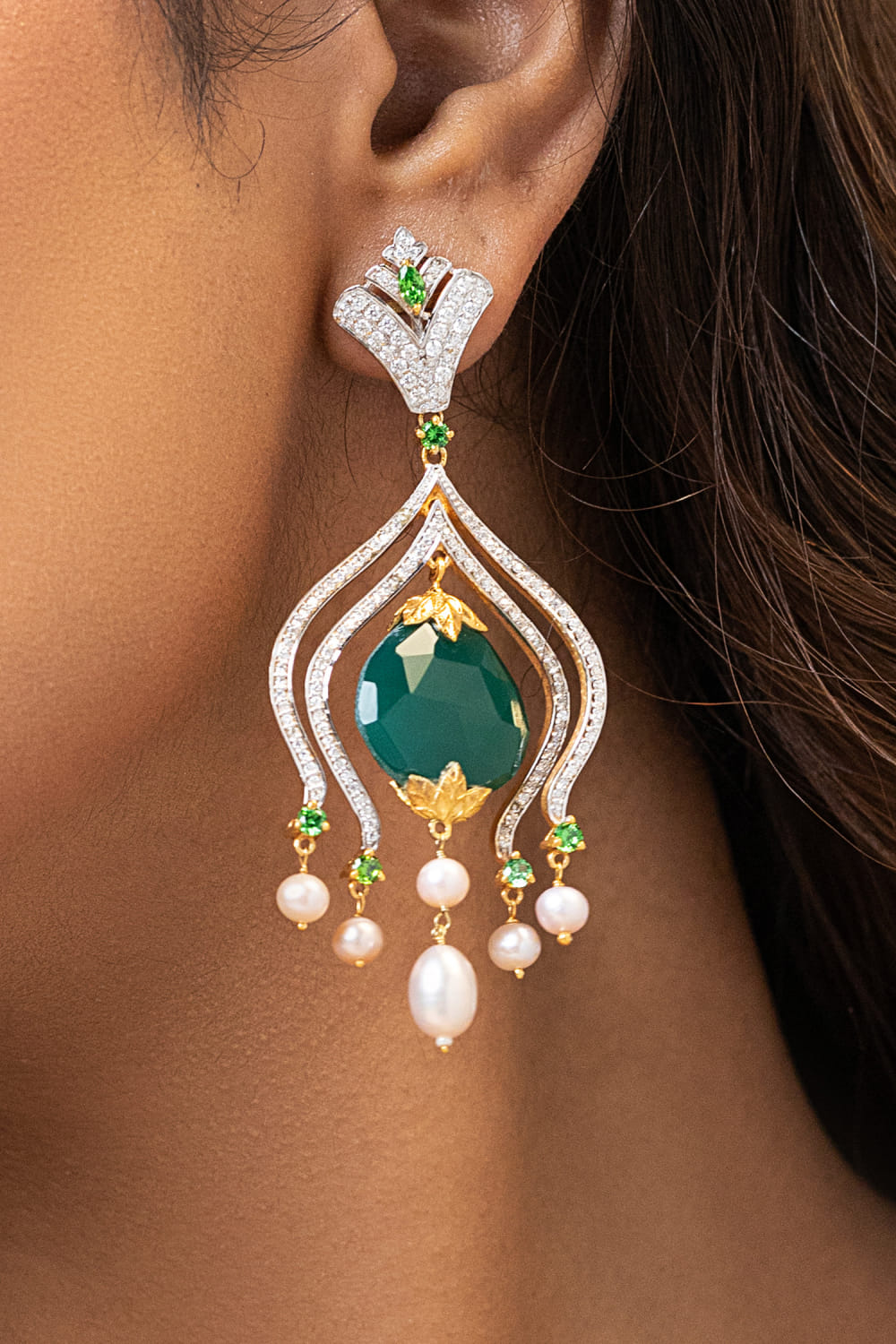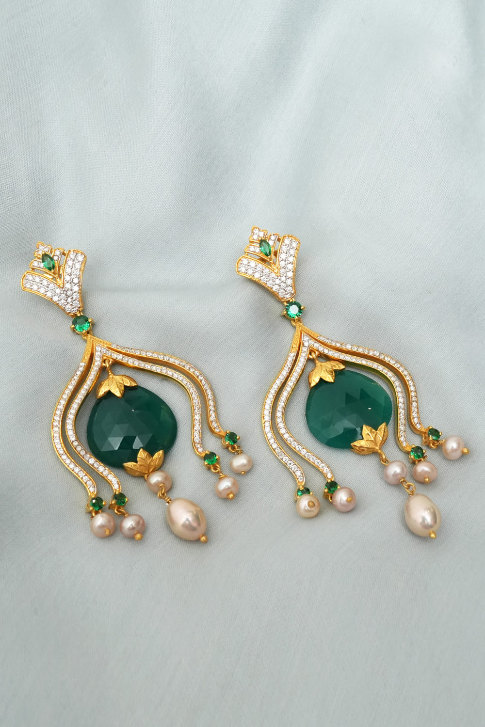 Ruuh Studios designs this vibrant pair of earrings crafted in 18kt gold-plated 925 sterling silver encapsulated with freshwater pearls, green onyx and moissanite embellishments. Style them with a kurta set for festivities.