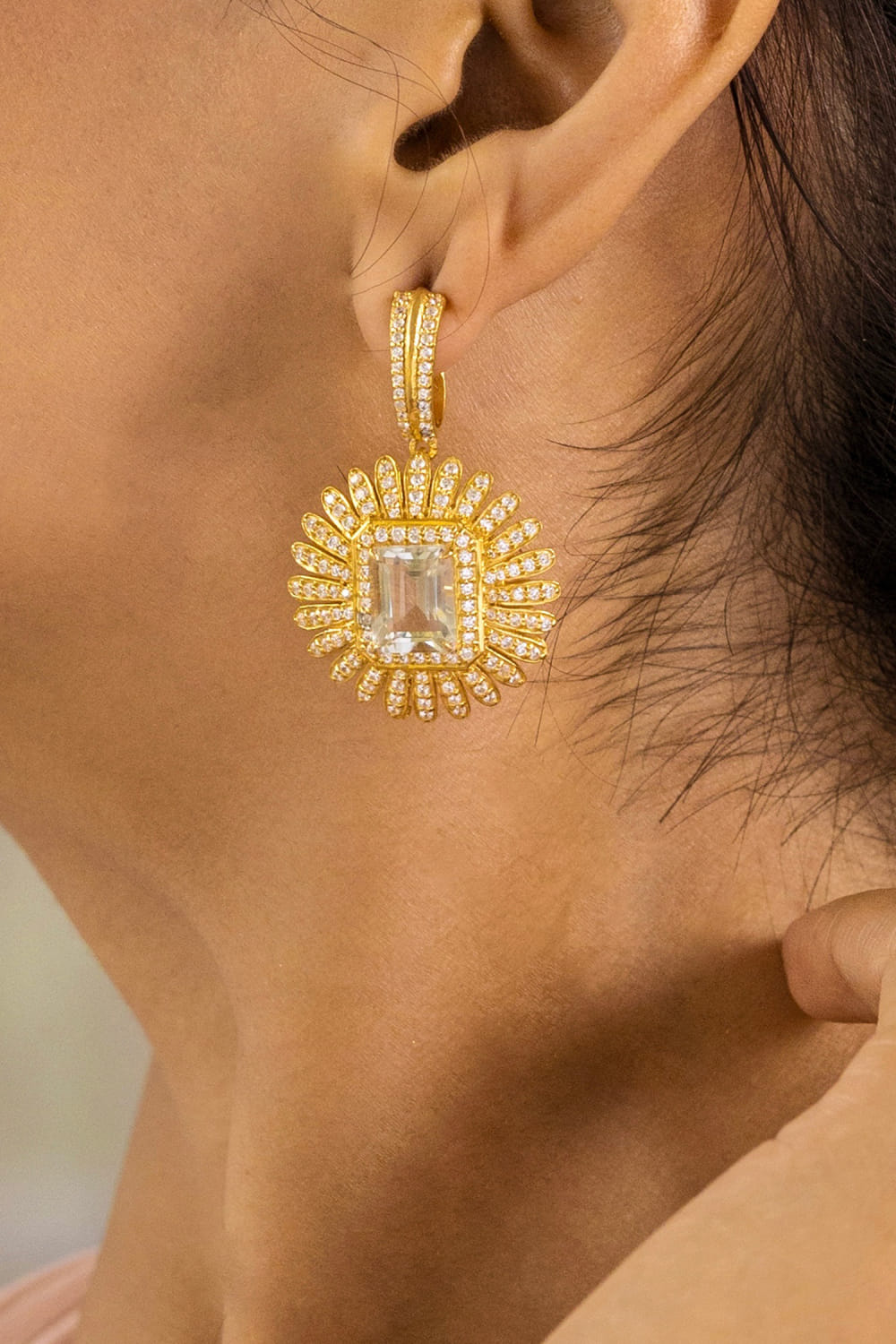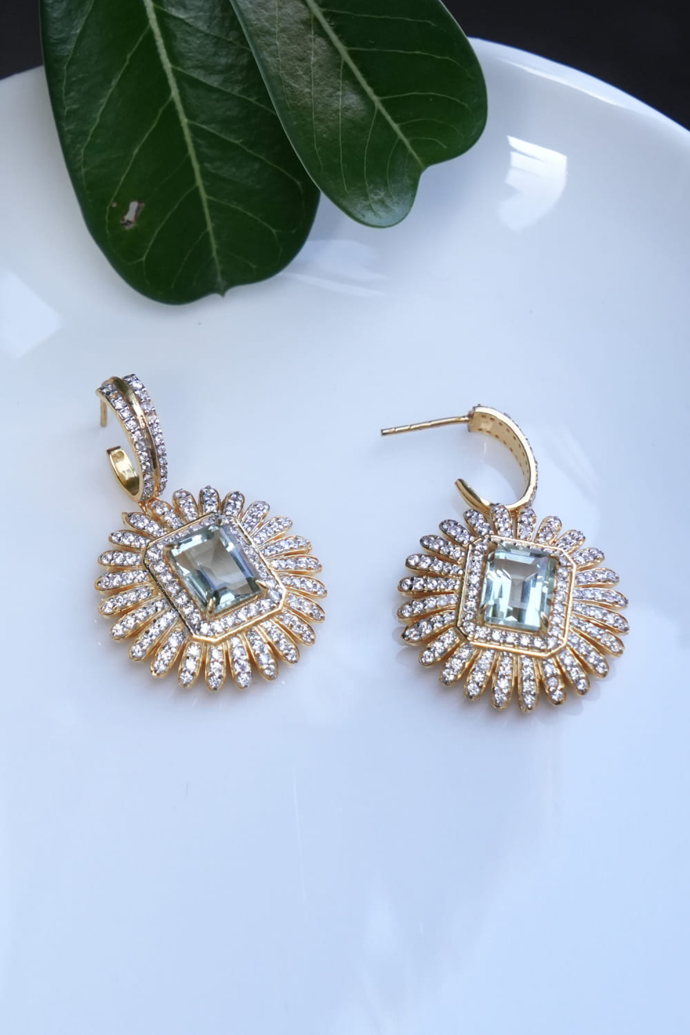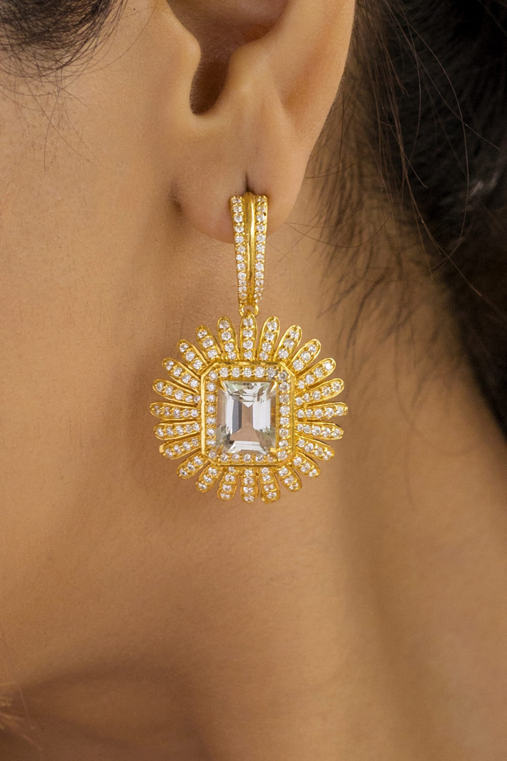 Ruuh Studios designs this opulent pair of earrings customised in 18kt gold-plated 925 silver studded with prasiolite, cubic zirconia and moissanite embellishments. Style them with a draped skirt set for a stylish look.