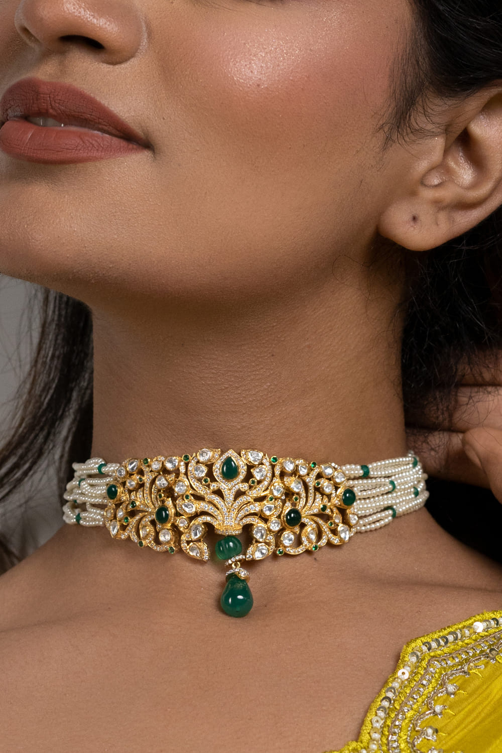 Ruuh Studios designs this traditional choker customised in 18kt gold-plated 925 silver adorned with green onyx, pearls, moissanite polki and moissanite embellishments. Style it with a handwoven sari set for a classic look.