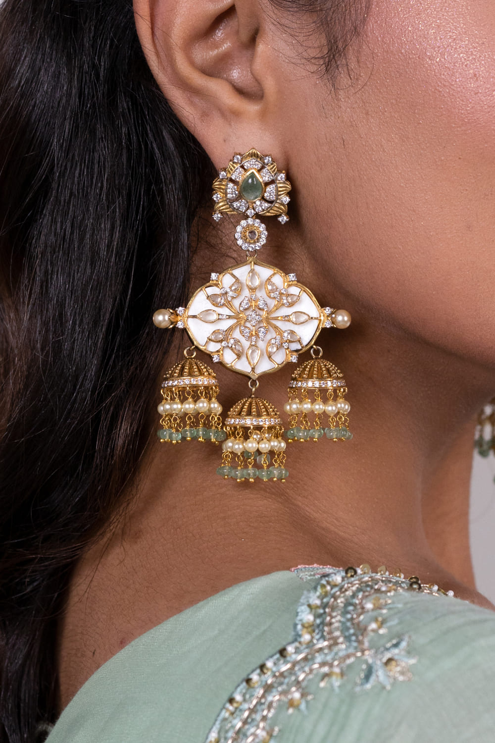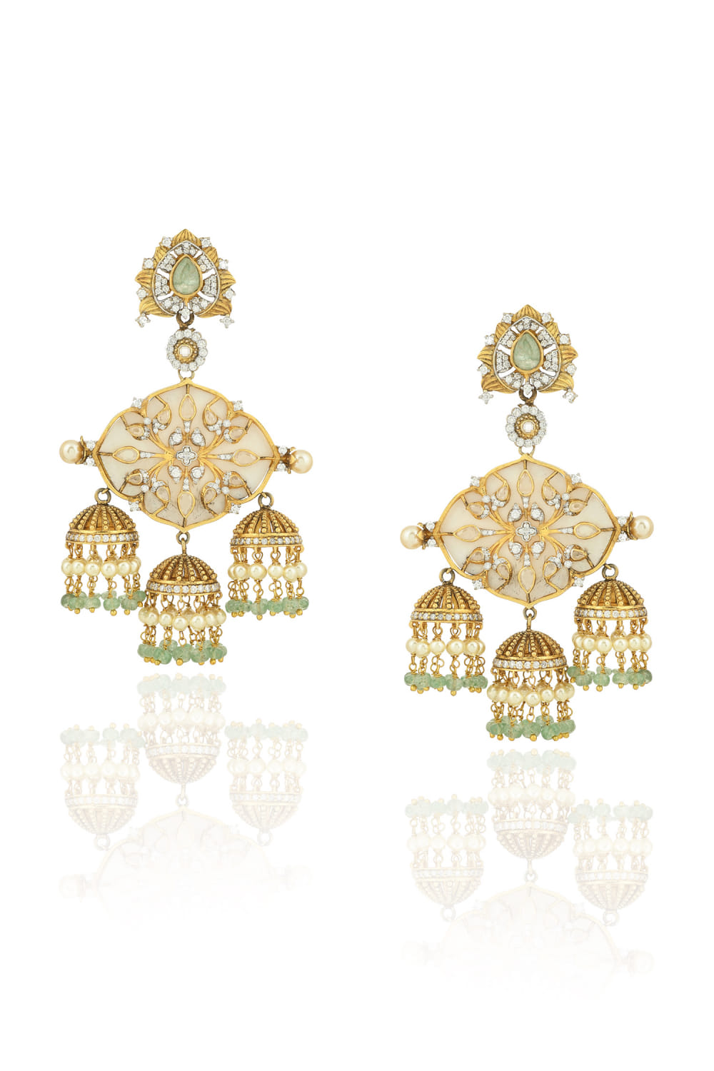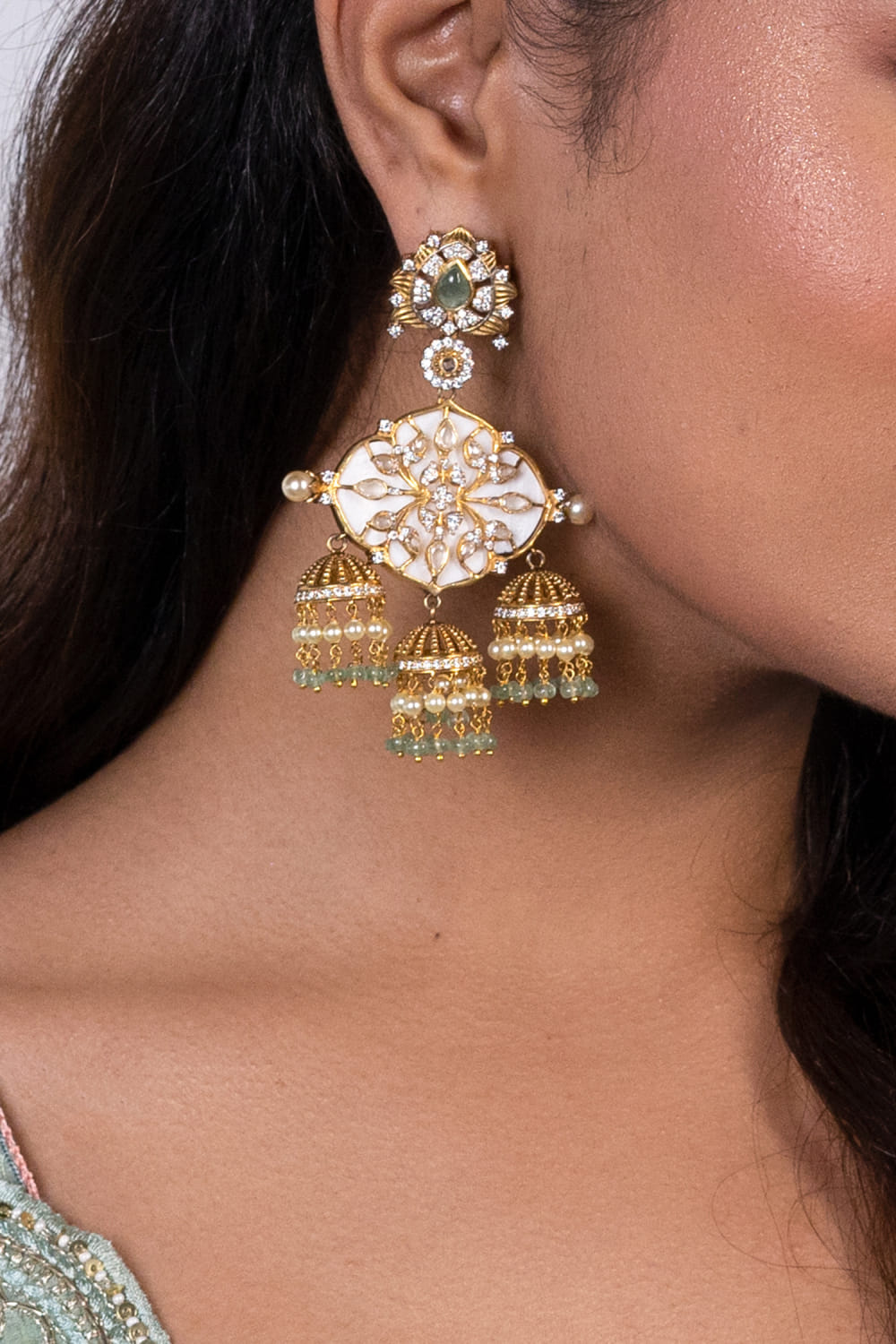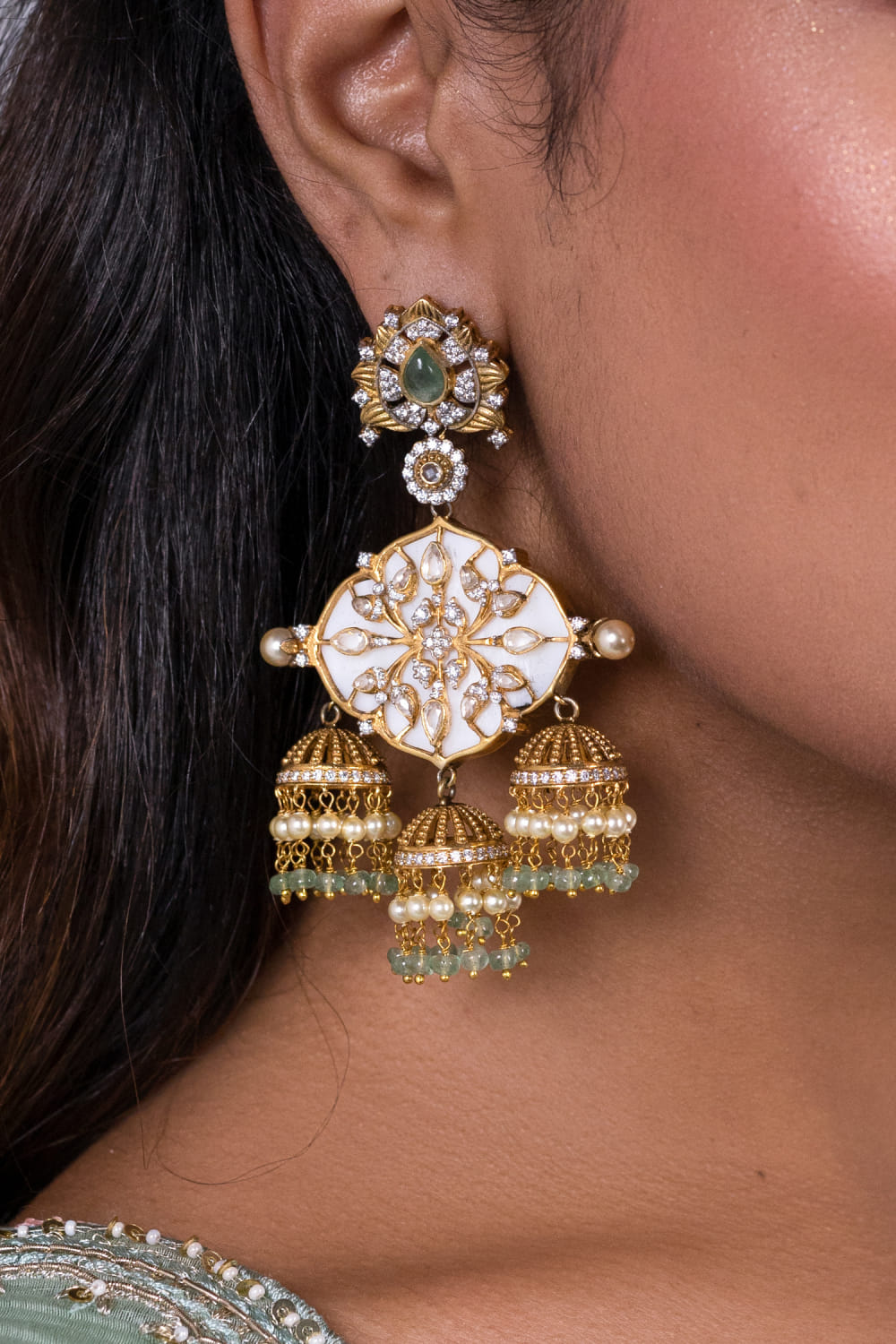 Ruuh Studios designs this mesmerising pair of jhumkas embellished with natural mother-of-pearl, aventurine quartz and moissanite detailing, crafted in 925 silver and 18kt gold plating. Style it with a chiffon saree for a statement look.
