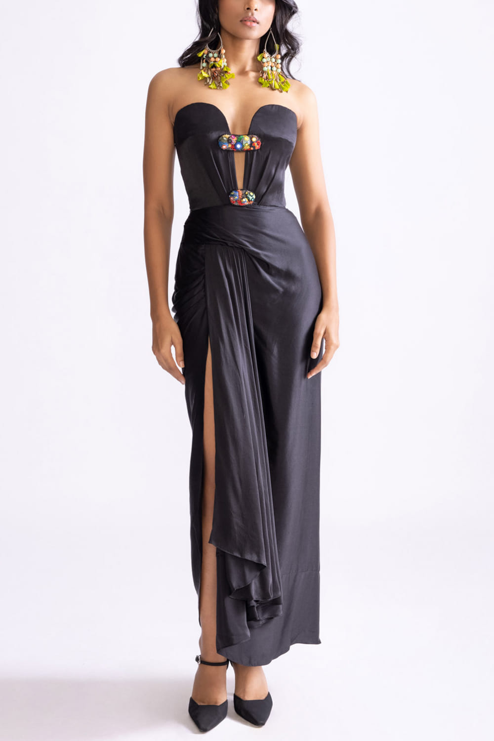 Black embroidered draped strapless gown