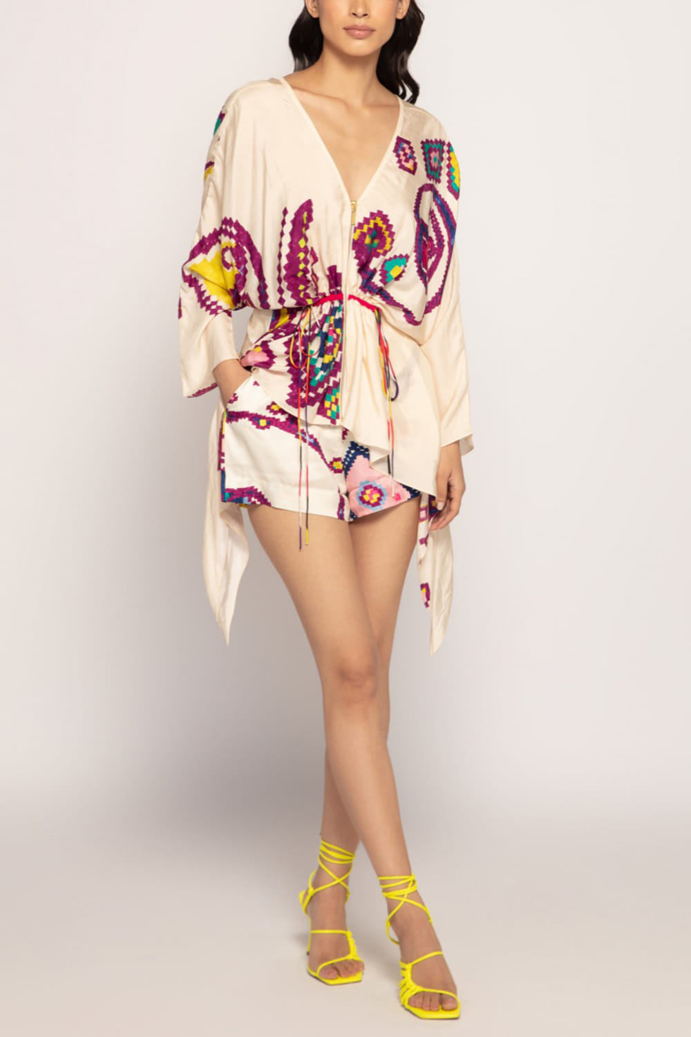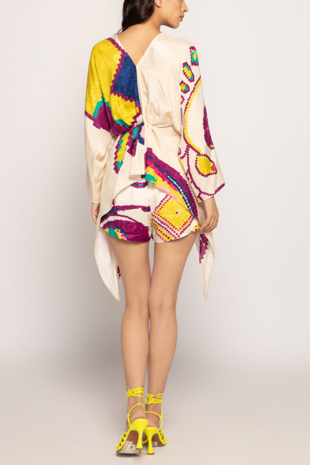 Saaksha & Kinni designs this breezy pair of short in satin with a high-rise waist and back elastic featuring paisley print patterns. Style the look with a tube top and a cape. The top here is shown for styling purposes only.