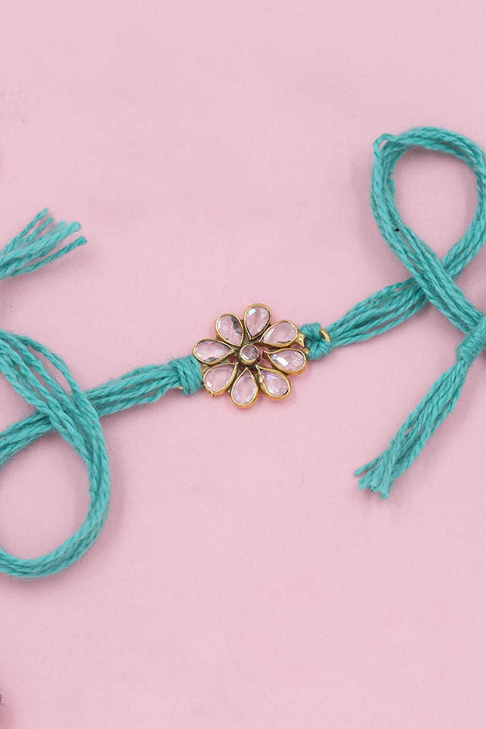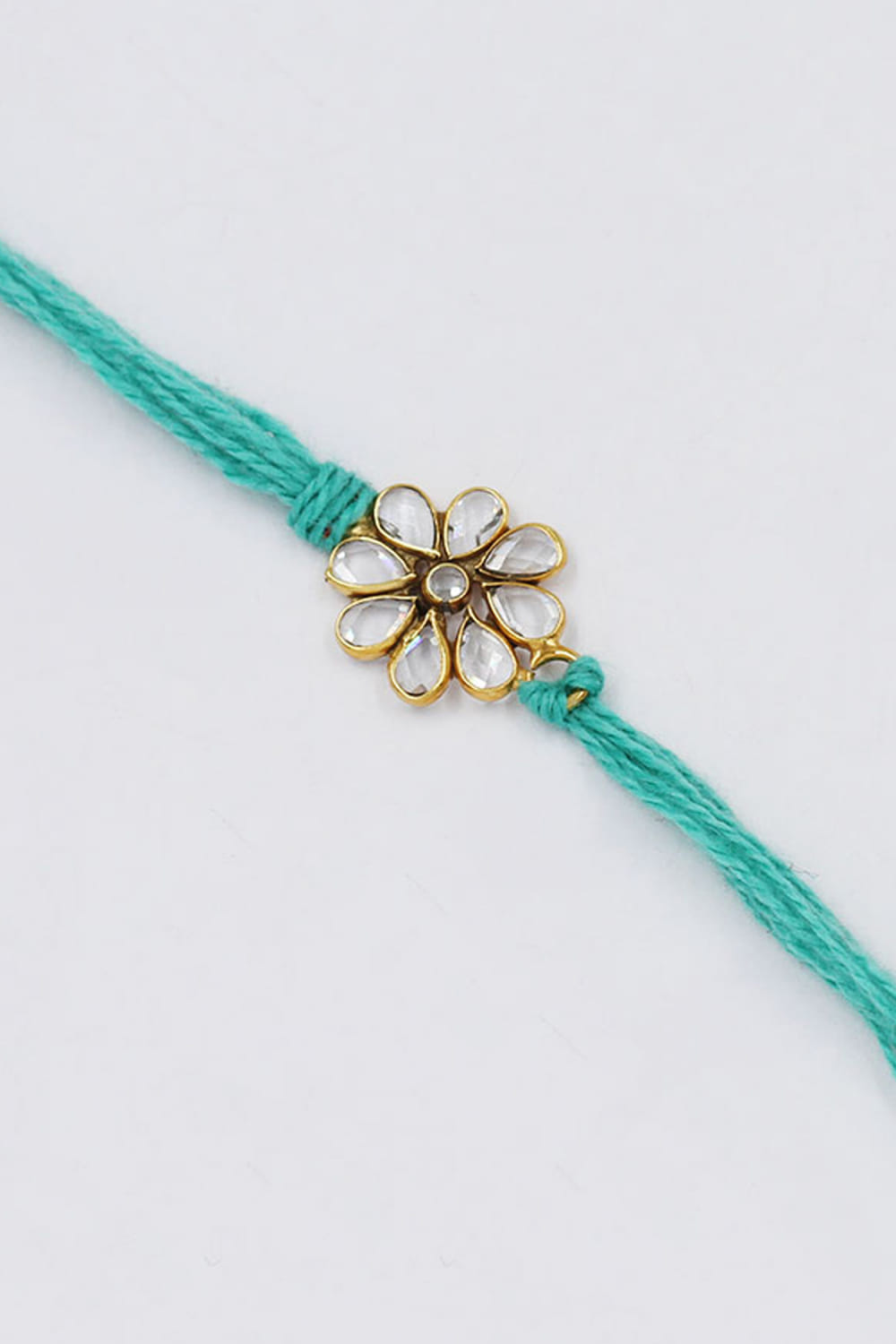 Sangeeta Boochra designs this ethereal rakhi for your brother embraced in 925 sterling silver adorned with checker stone embellishments in a floral shape.