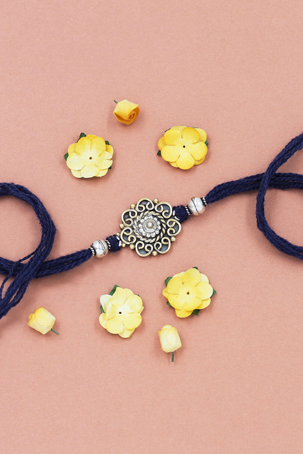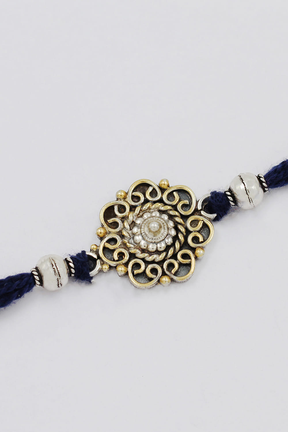 Sangeeta Boochra designs this limelight-stealing rakhi for your brother embraced in 925 sterling silver featuring intricate detailing and delicate embellishments in floral and circular shapes.