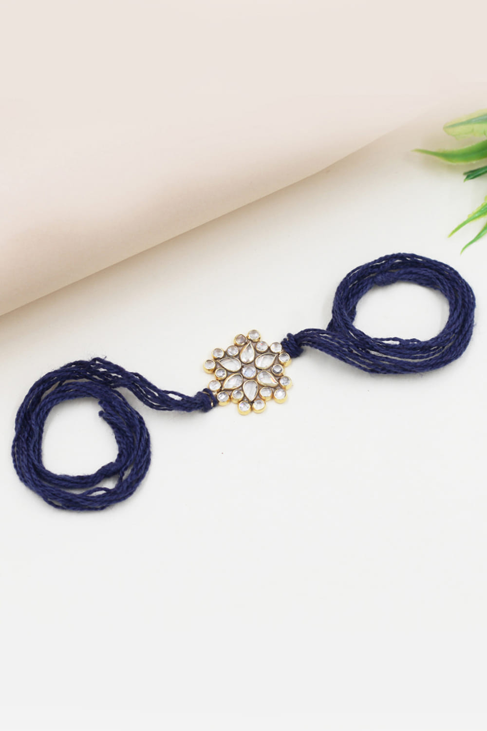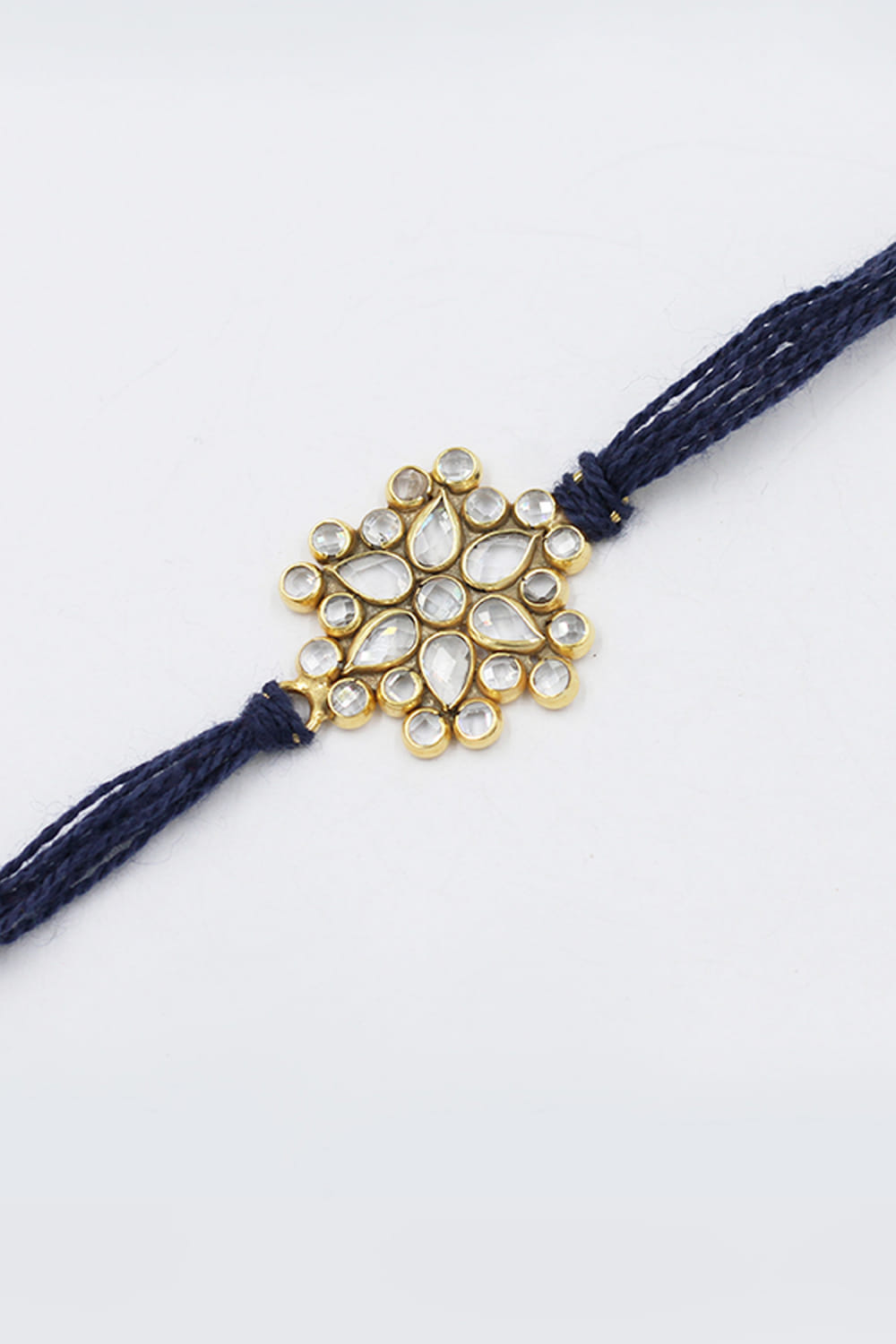 Sangeeta Boochra designs this ethereal rakhi for your brother customised in 925 sterling silver embedded with checker stone embellishments in a floral shape.