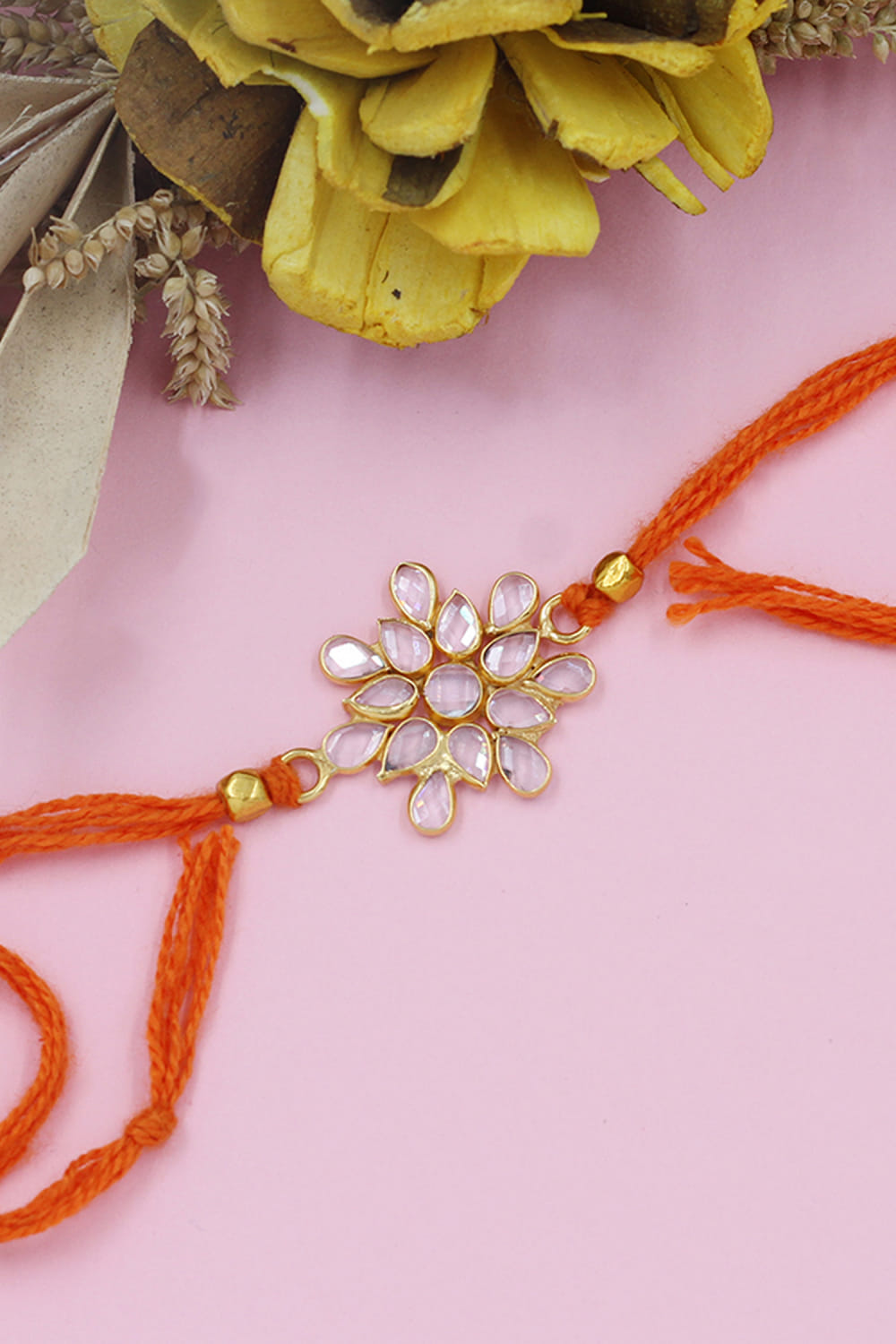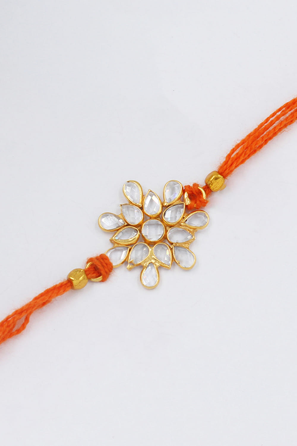 Sangeeta Boochra designs this alluring rakhi for your brother crafted in 925 sterling silver encrusted with checker stone embellishments in a floral shape.