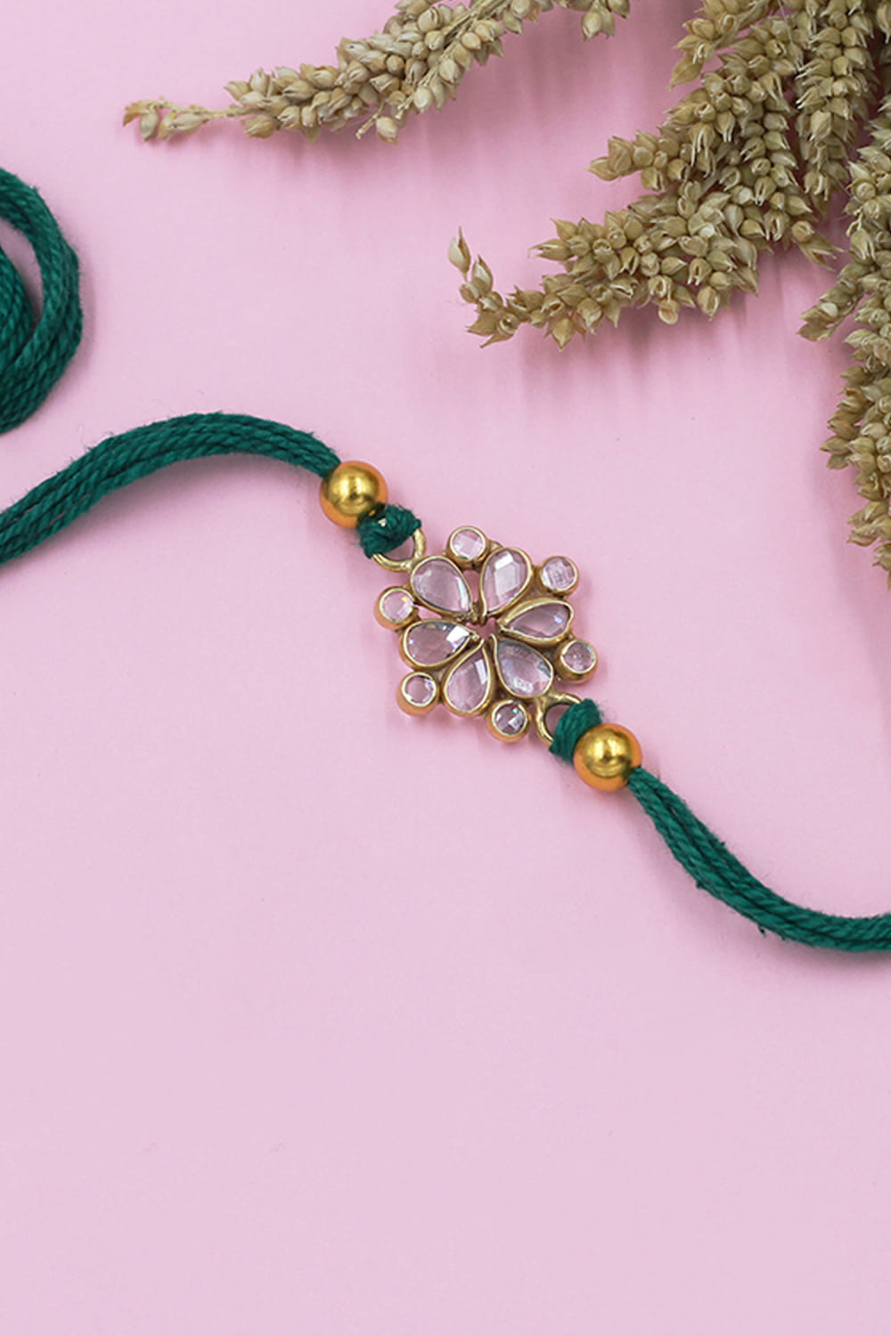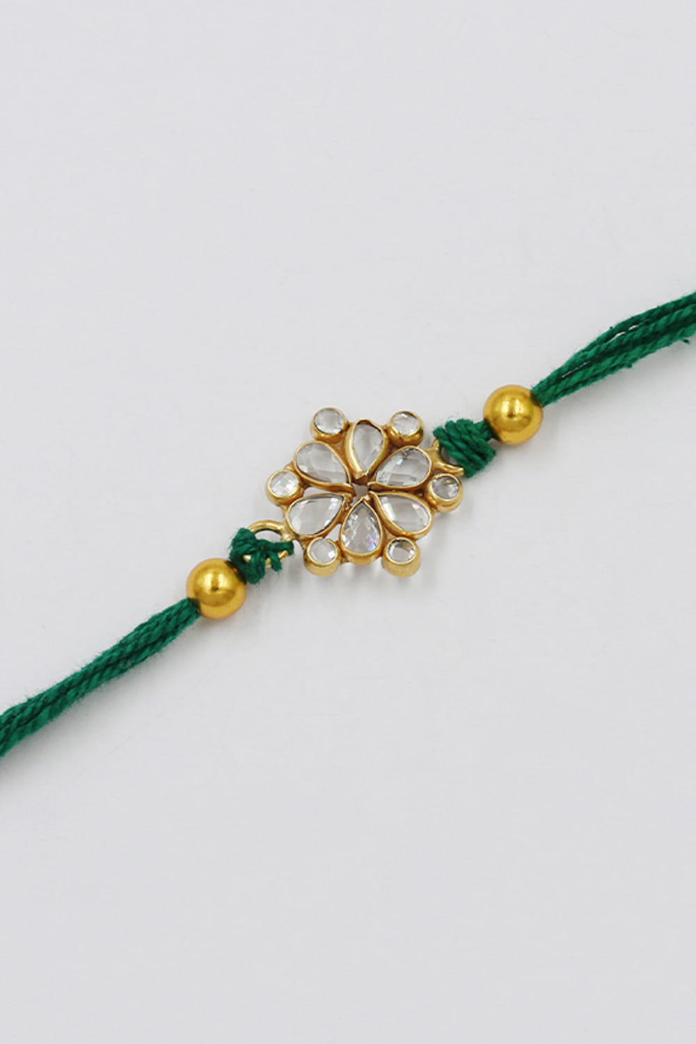 Sangeeta Boochra designs this stunning rakhi for your brother embraced in 925 sterling silver adorned with checker stone embellishments in a floral shape.