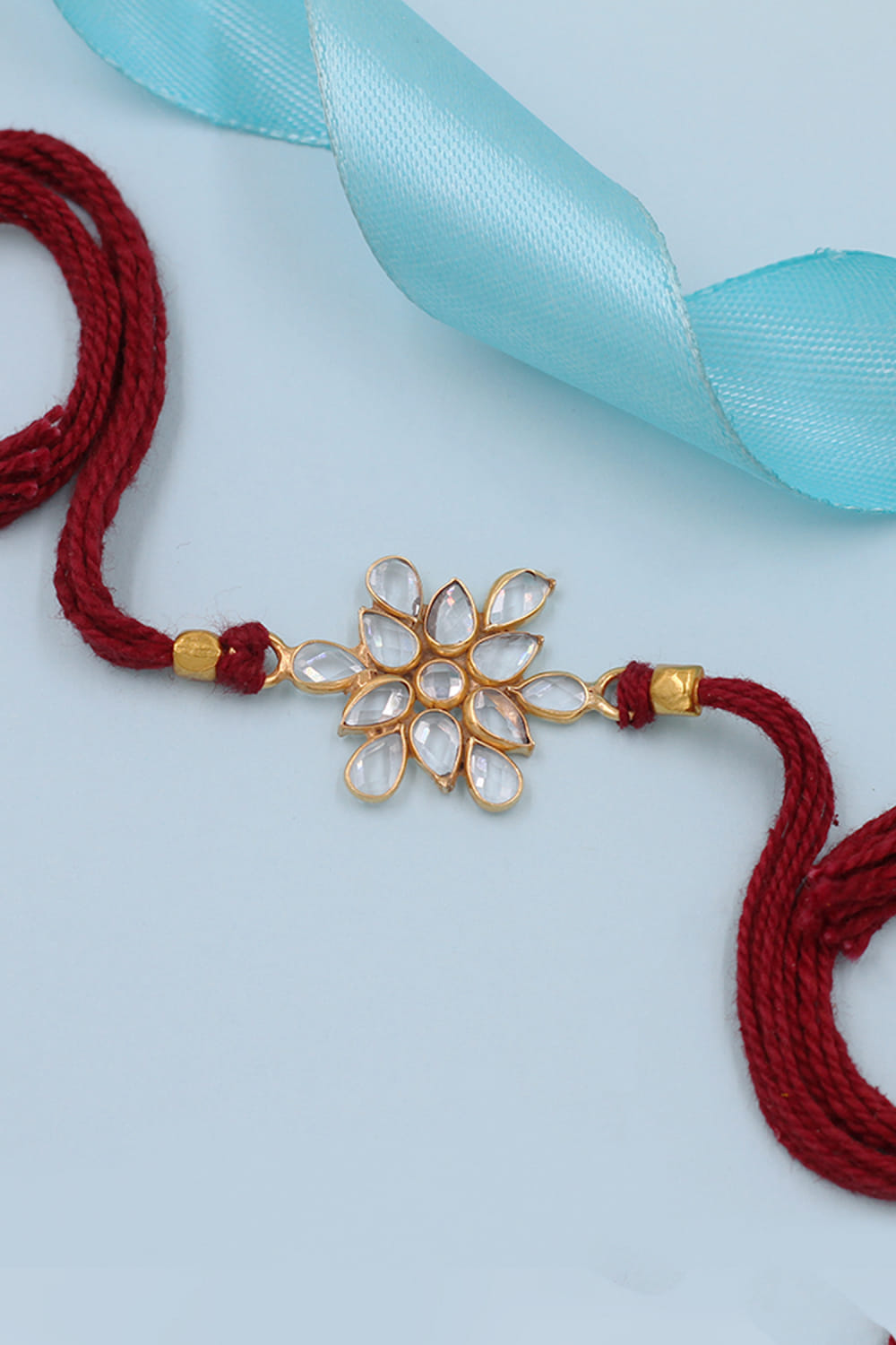 Sangeeta Boochra designs this gleaming rakhi for your brother rendered in 925 sterling silver encrusted with checker stone embellishments in a floral shape.