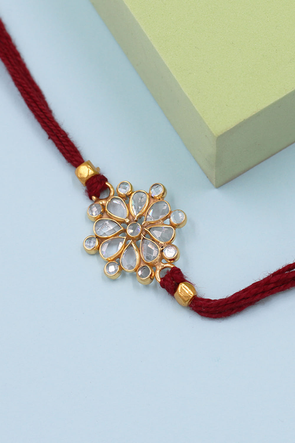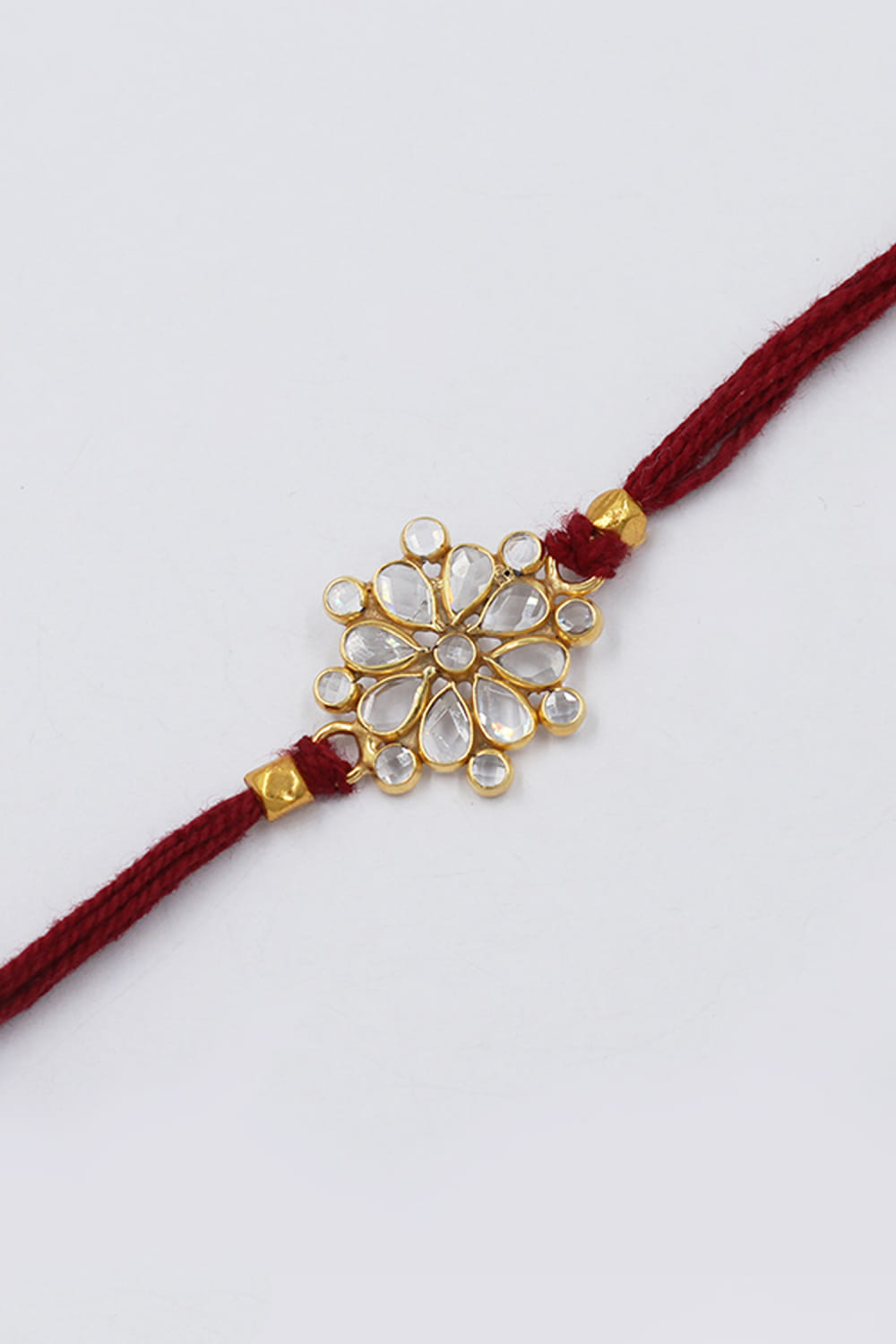 Sangeeta Boochra designs this captivating rakhi for your brother crafted in 925 sterling silver embedded with checker stone embellishments in a floral shape.