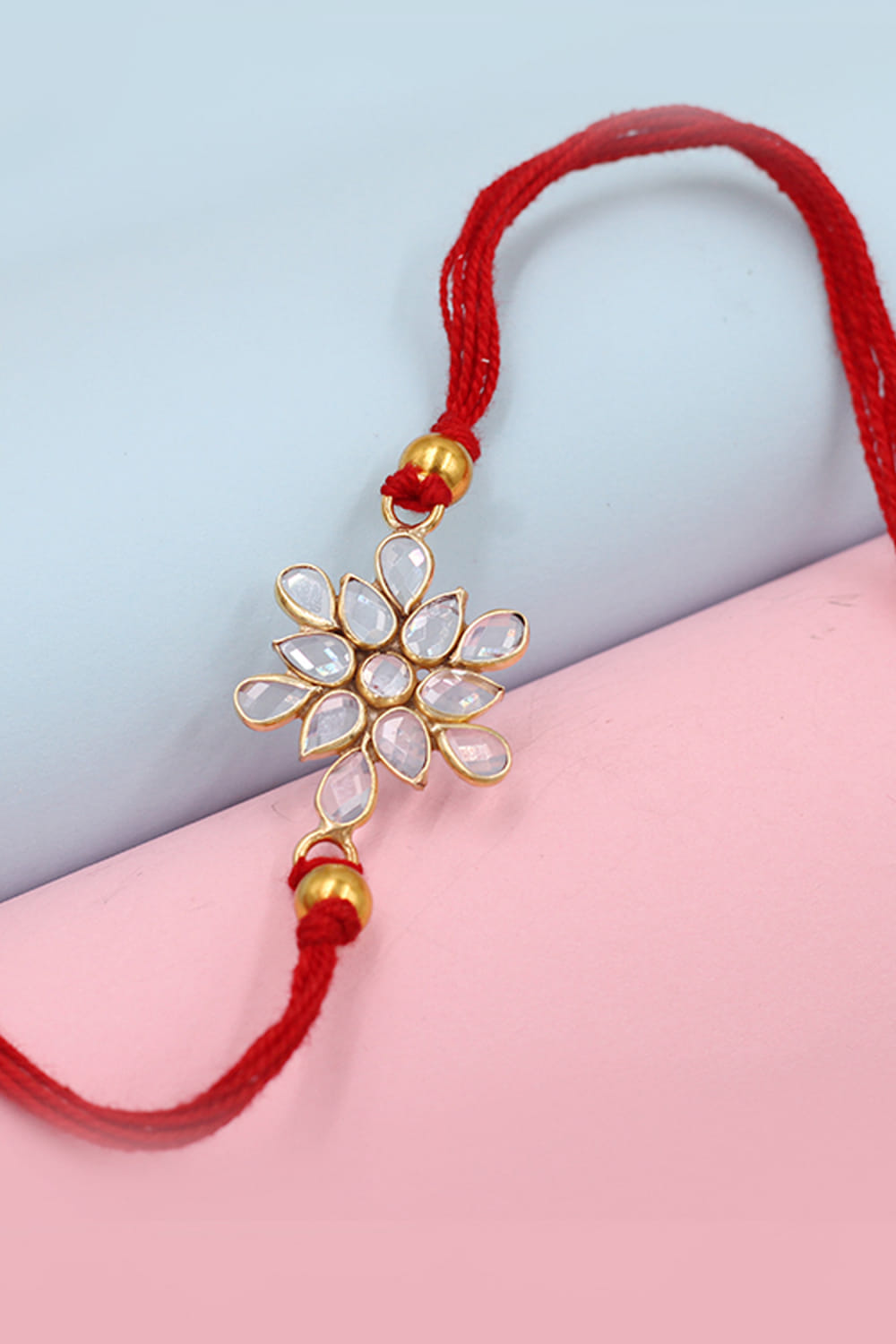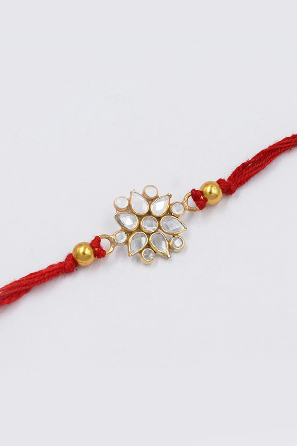 Sangeeta Boochra designs this exquisite rakhi for your brother embraced in 925 sterling silver studded with checker stone embellishments in a floral shape.