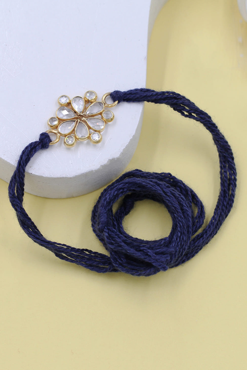 Sangeeta Boochra designs this limelight-stealing rakhi for your brother customised in 925 sterling silver studded with checker stone embellishments in a floral shape.