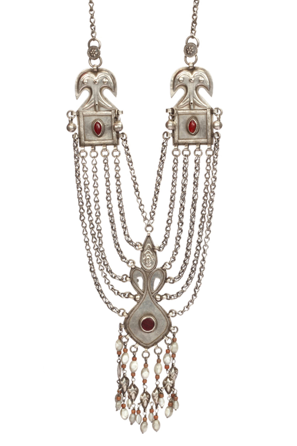 Sangeeta Boochra designs this antique necklace handcrafted in multiple silver chains, embellished with coloured stone and danglers. Style it with a brocade lehenga for an ethnic charm.