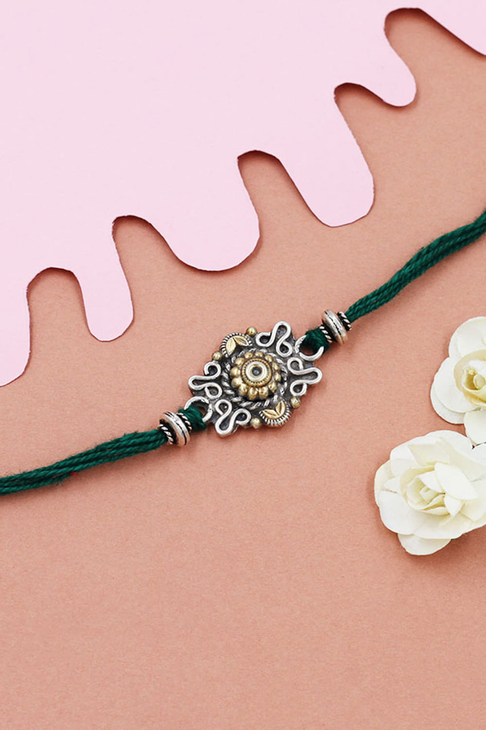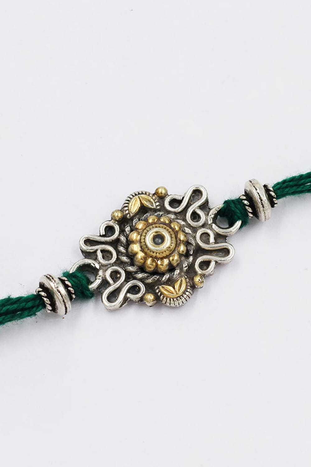 Sangeeta Boochra designs this marvellous rakhi for your brother rendered in 925 sterling silver featuring intricate detailing and delicate embellishments in a circular shape.