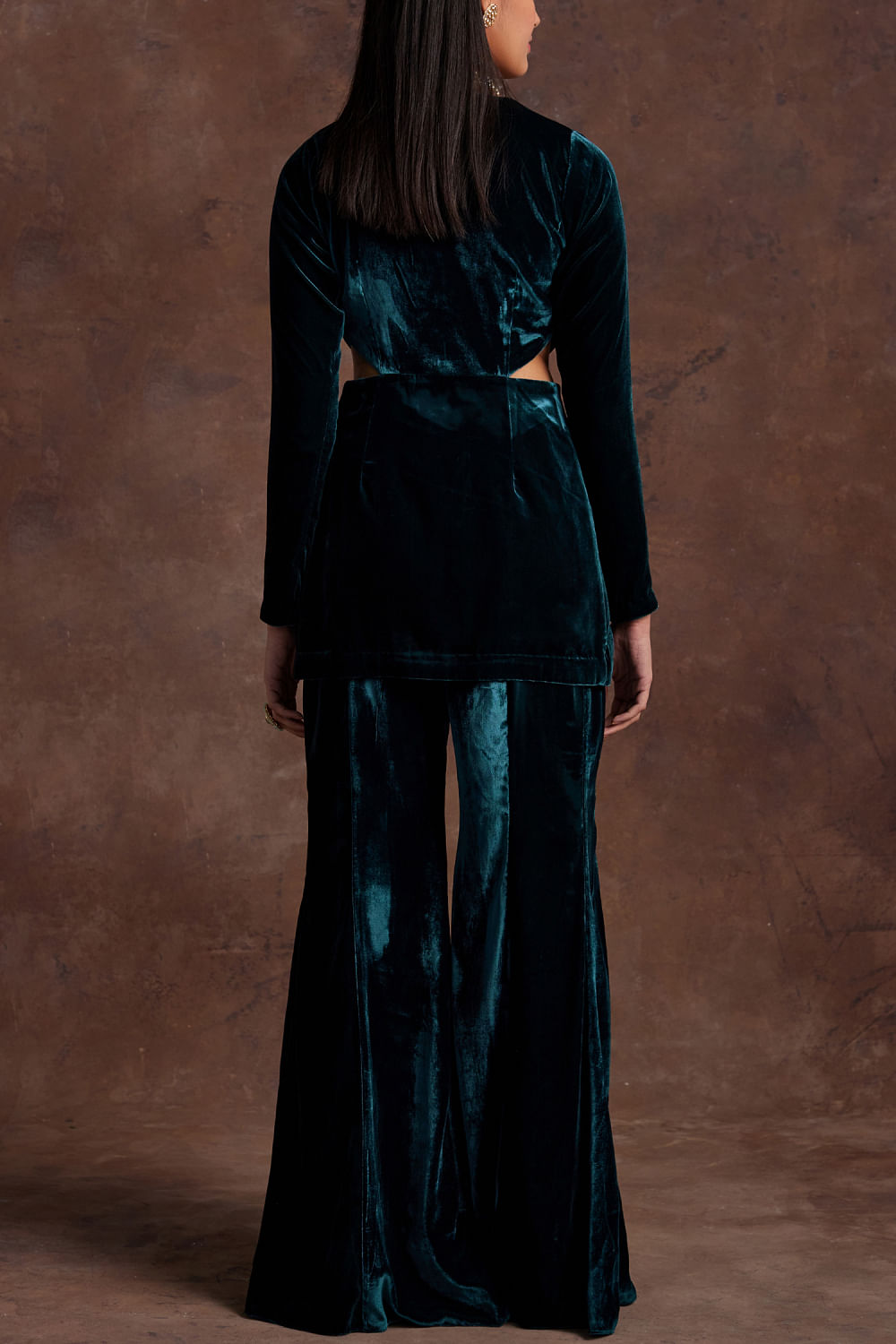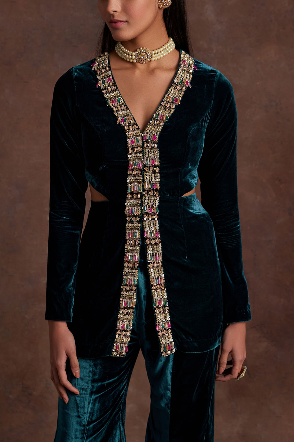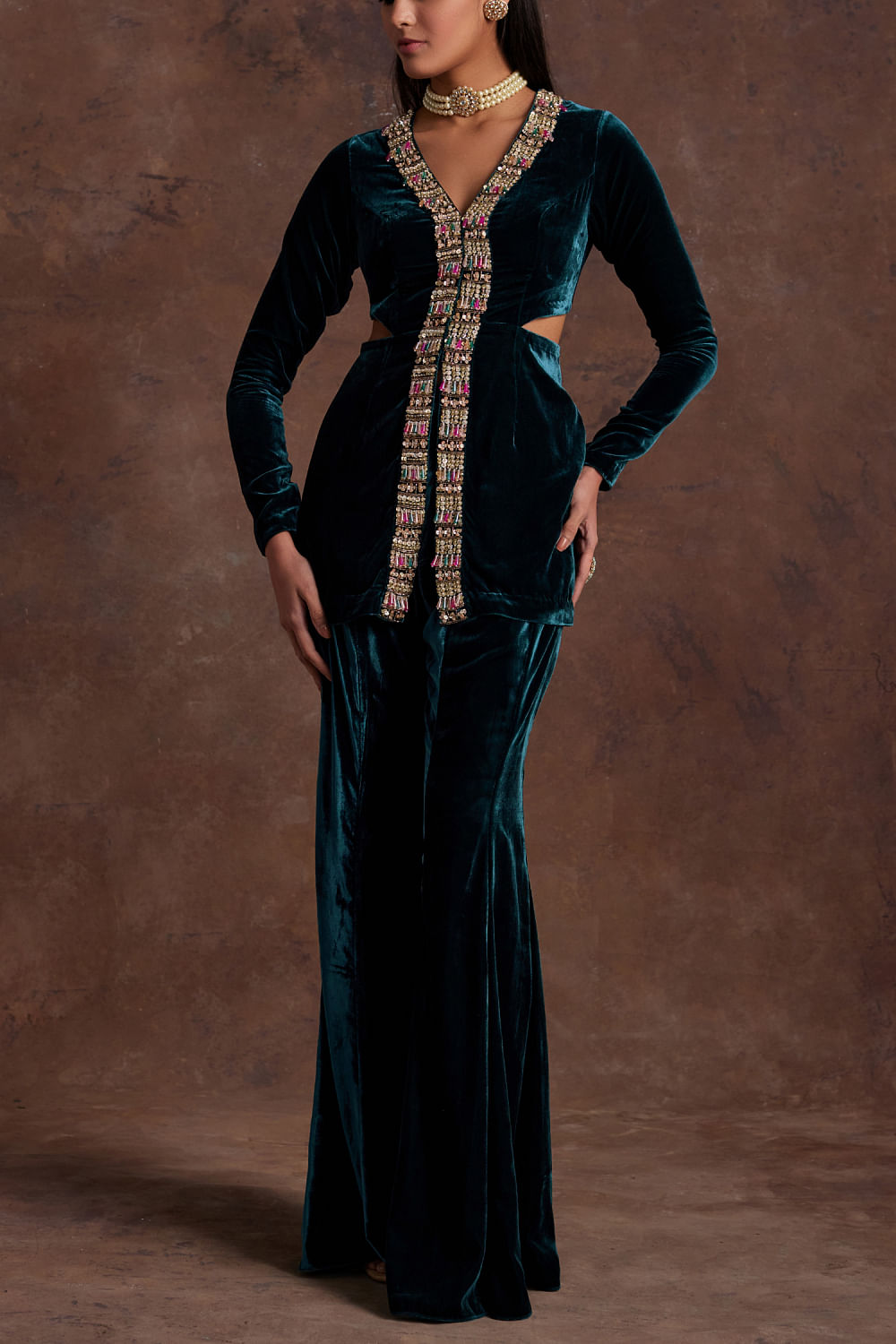Sanya Gulati designs this mesmerising top in silk velvet with waist cutouts and placement embroidery detailing, completing it with a pair of pants. Style the look with a pearl choker set and metallic stilettoes for a lasting impression.